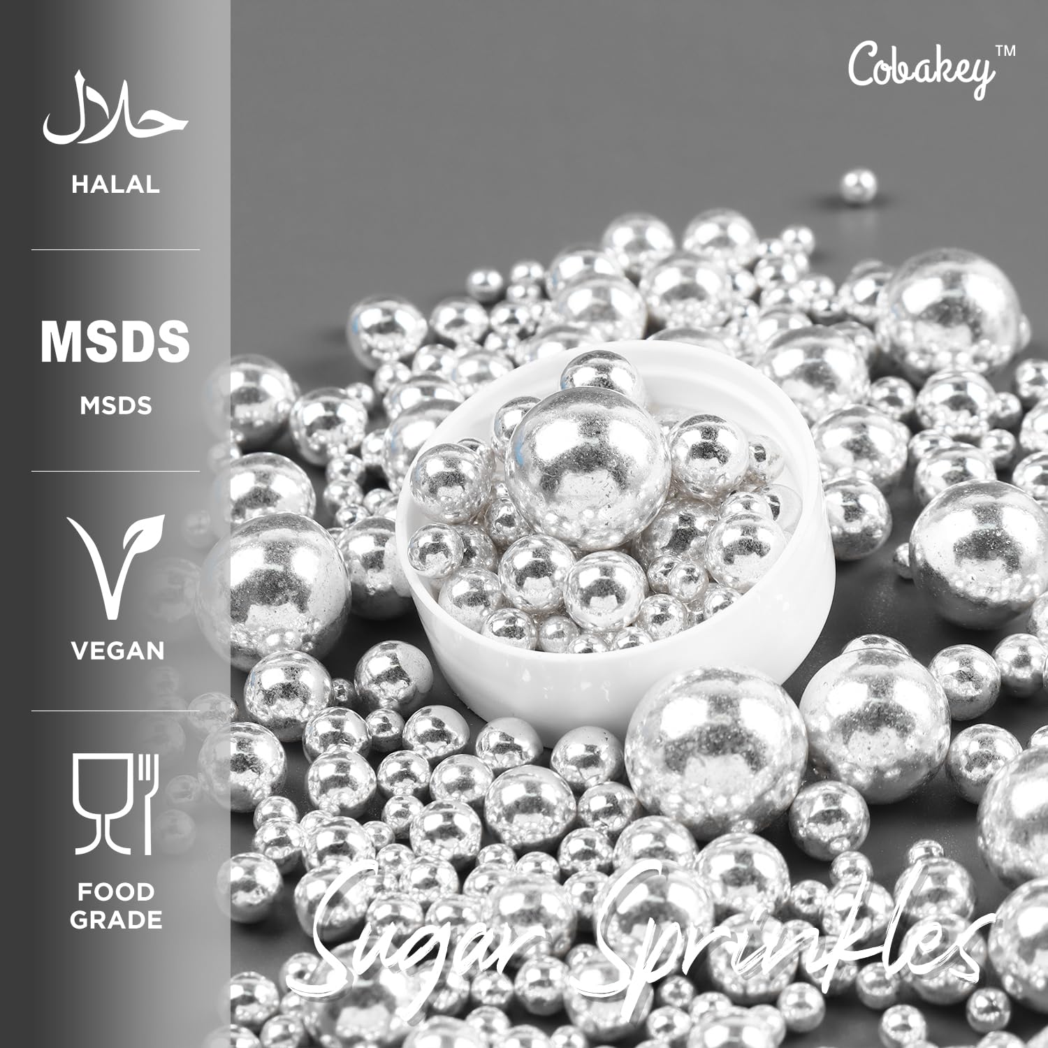 Q: What are Cobakey Bright Silver Sprinkles made of?A: Cobakey Bright Silver Sprinkles are made from sugar and carnauba wax. They are nut-free, making them a safe option for a variety of baking projects.