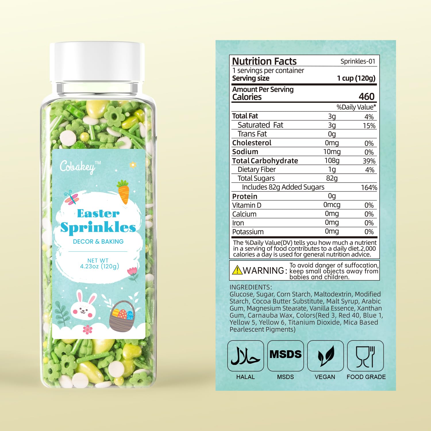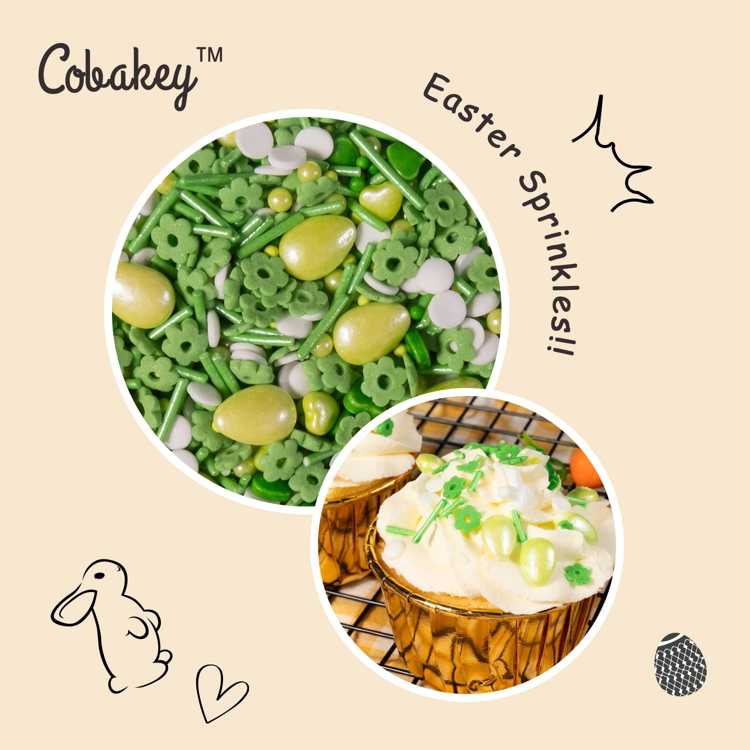 Q: What are Cobakey Easter Sprinkles made of?A: Cobakey Easter Sprinkles are made from safe, edible ingredients, designed specifically for enhancing baked goods. They come in vibrant colors, primarily yellow and green, to add a festive touch to your cookies, cakes, and desserts.