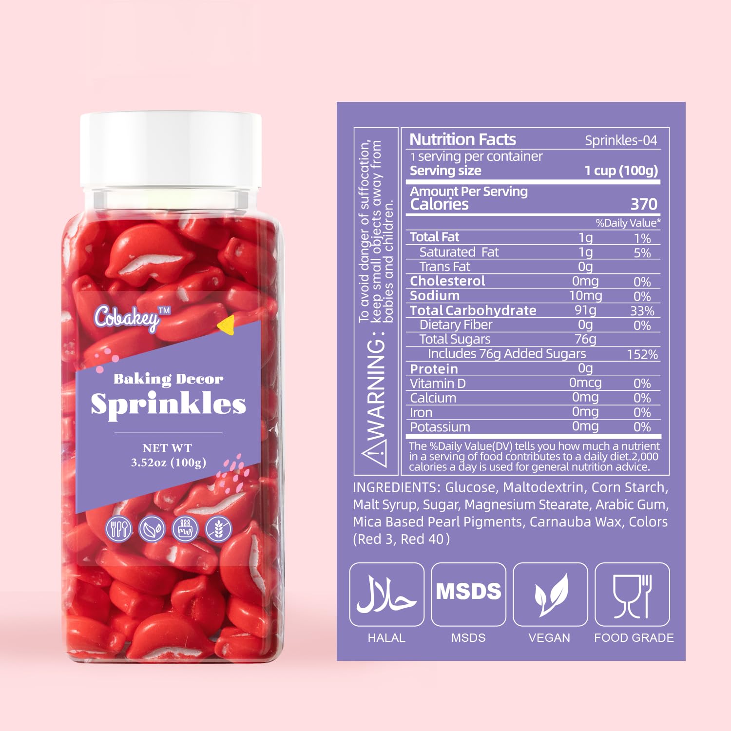 Q: What are Cobakey Red Sprinkles made of?A: Cobakey Red Sprinkles are made from safe, high-quality ingredients designed for cake decorating and enhancing the appearance of baked goods.