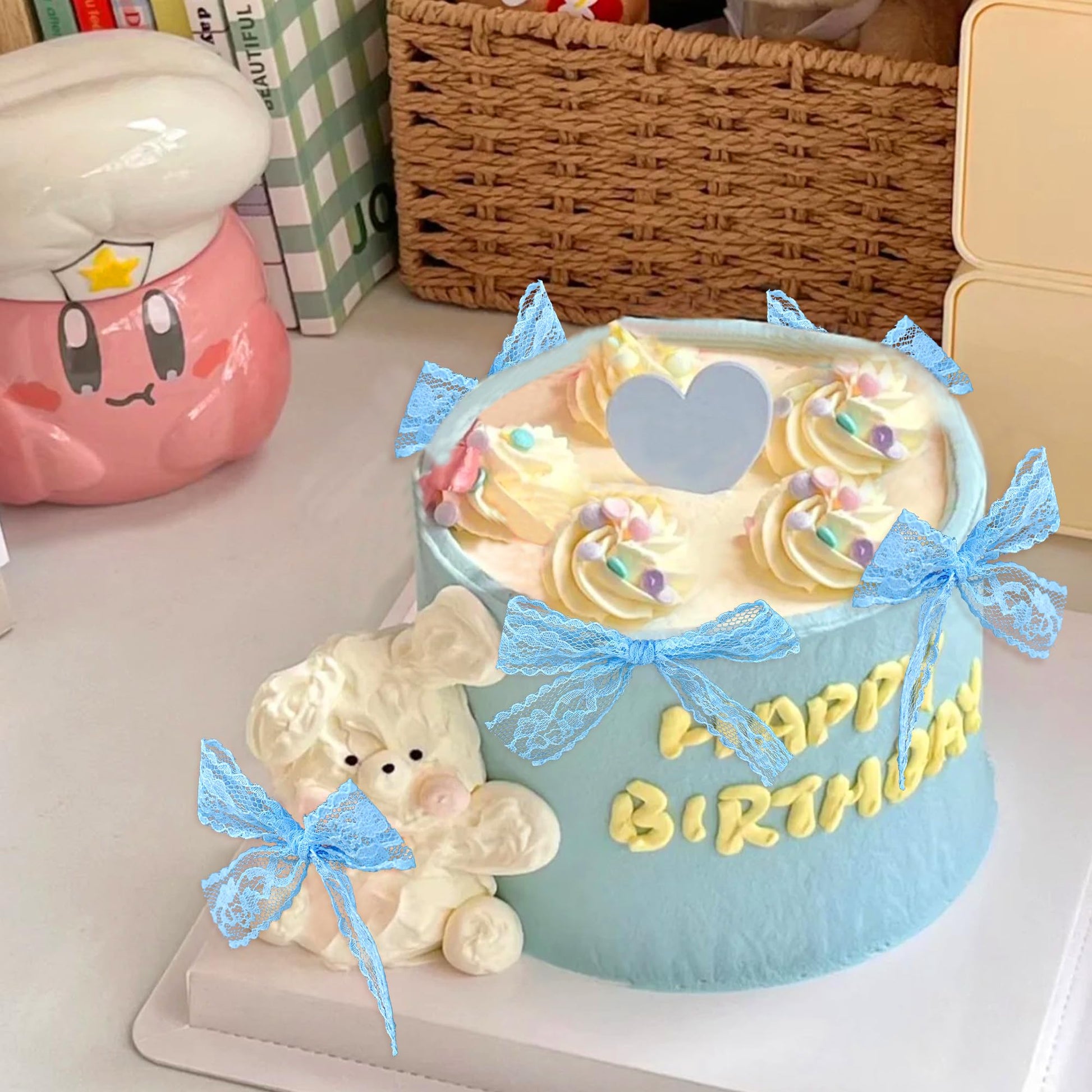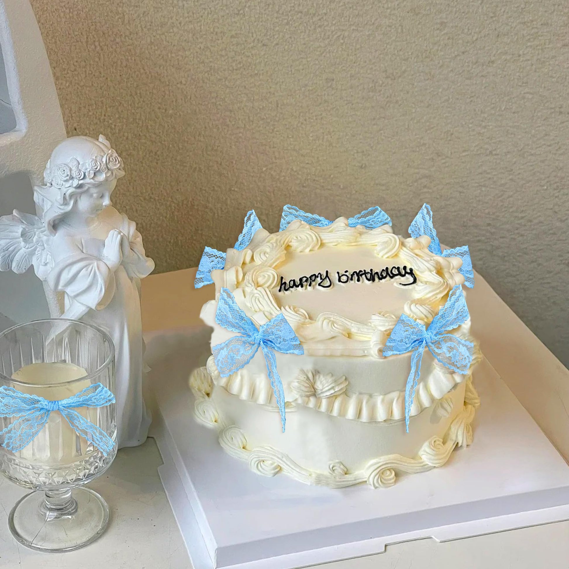 Q: Are the cupcake toppers made from safe materials?A: Yes, the blue bow cupcake toppers are made from safe lace material, ensuring they can be placed directly onto cakes without any health concerns.
