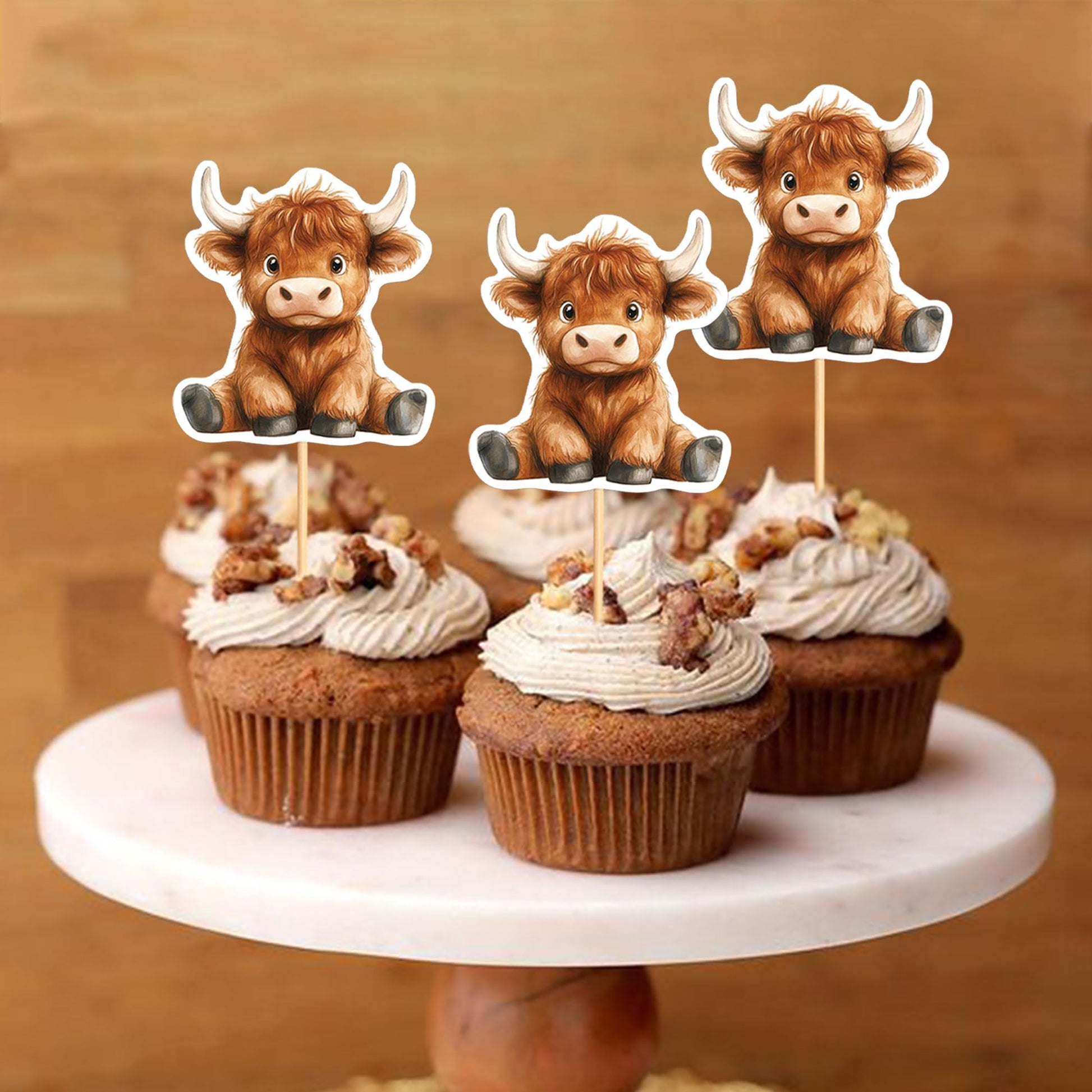 Q: How many cupcake toppers come in a package?A: Each package includes 24 pieces of Highland Cow Cupcake Toppers, allowing you to easily decorate multiple cupcakes or desserts for your event.