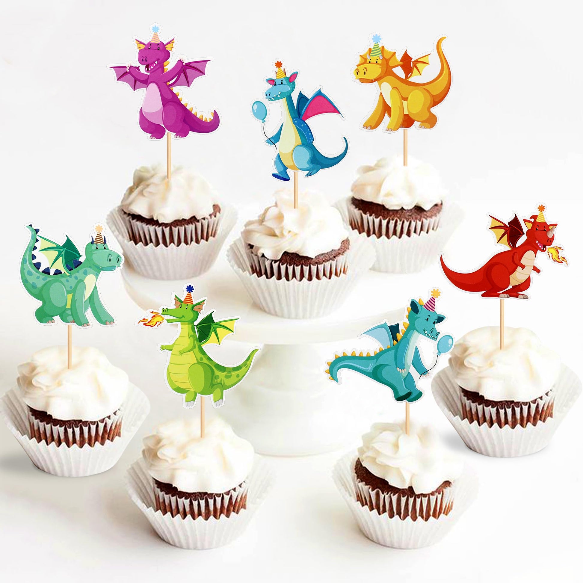Q: How many cupcake toppers are included in the package?A: Each package contains 24 cupcake toppers, featuring three different dragon designs with eight pieces of each pattern, providing a fun variety for your dragon-themed party.