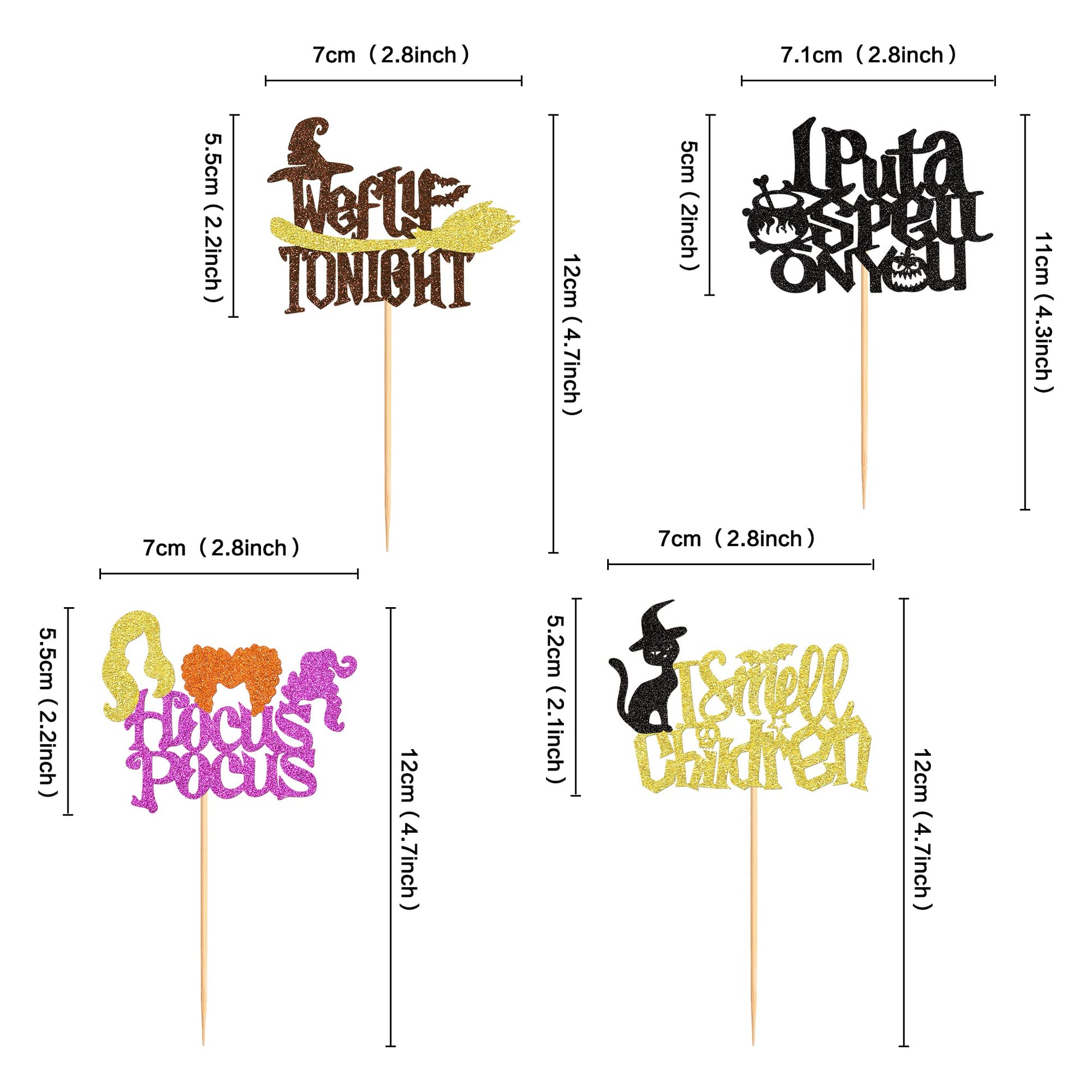 Ercadio 24 Pack Hocus Pocus Witch Hair Cupcake Toppers Halloween I Put A Spell On You Cupcake Picks - Material: 300G Glitter Card-Stock And Toothpicks Stick,Non-Toxic,Eco-Friendly, Biodegradable. - Package: Pack Of 24 Pcs Cupcake Toppers,4 Designs And Each For 6Pcs.Handmade And Pre-Assembled. - Size: 2.8*4.7 Inch / 2.8*4.3 Inch / 2.8*4.7 Inch / 2.8*4.7 Inch (Including Stick). - Perfect For Halloween Theme Party,Baby Shower Party,Birthday Theme Party Cupcake Decorations Supplies. - Great Accessory For Cupcakes,Cakes,Ice Cream,Fruit,Dessert,Cheese,And Any Food You Want To Dress Up. - 100% Satisfaction Guarantee-We Value Every Customer'S Shopping Experience And 100% Support Customer Refunds When Unsatisfied.No-Risk For All Our Customers. - Friendly Reminder:Designed For Single-Sided,Another Side Is Plain White. If You Have Any Problems,Please Contact Us, We Will Try Our Best To Solve Your Problem Within 24 Hours. Note: 1. Return Policy: You Can Return The Item If Not Satisfied, But Please Kindly Contact Us First, So That We Can Deal With It Immediately Until You Are Satisfied. 2. Color Might Be Slightly Different Due To The Color Calibration Of Each Individual Monitor. 3. Please Allow The Tiny Measuring Deviation Due To Manual Measurement. 4. Thanks For Your Understanding And Enjoy Your Shopping Moment! About Ercadio The Ercadio Is The Registered Brand (Ser. No. 88-495,201),Which Is The Original Manufacturer For The Cupcake Toppers And Party Cake Decoration. We Offer The Customized Service For Many Wholesalers And Retailers. We Are Rich In Experience With Advanced Management System & Quality Control System, So We Always Offer High Quality Products To All Customers. It Is Our Final Goal To Make Your Party Happy !