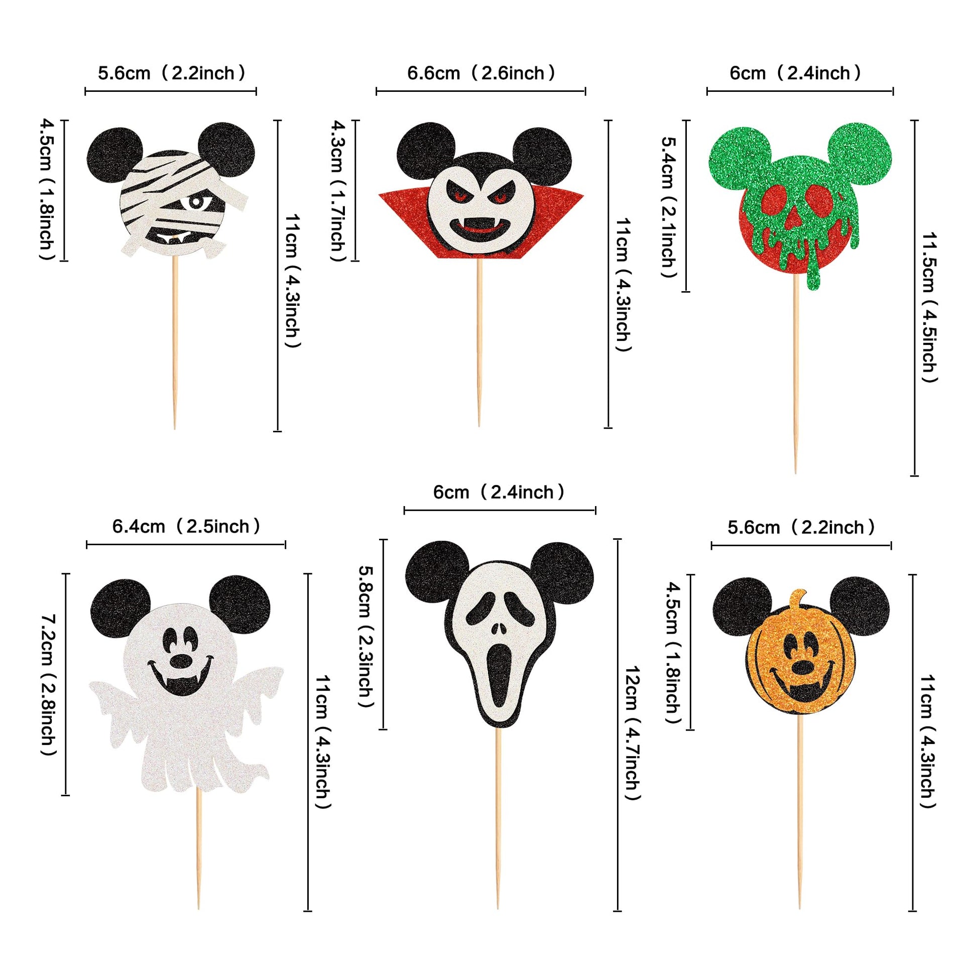 Q: How many cupcake toppers are included in a pack?A: Each pack contains 24 cupcake toppers, featuring 6 different mouse-inspired designs with 4 pieces of each design. This variety adds a fun touch to your Halloween or birthday party.