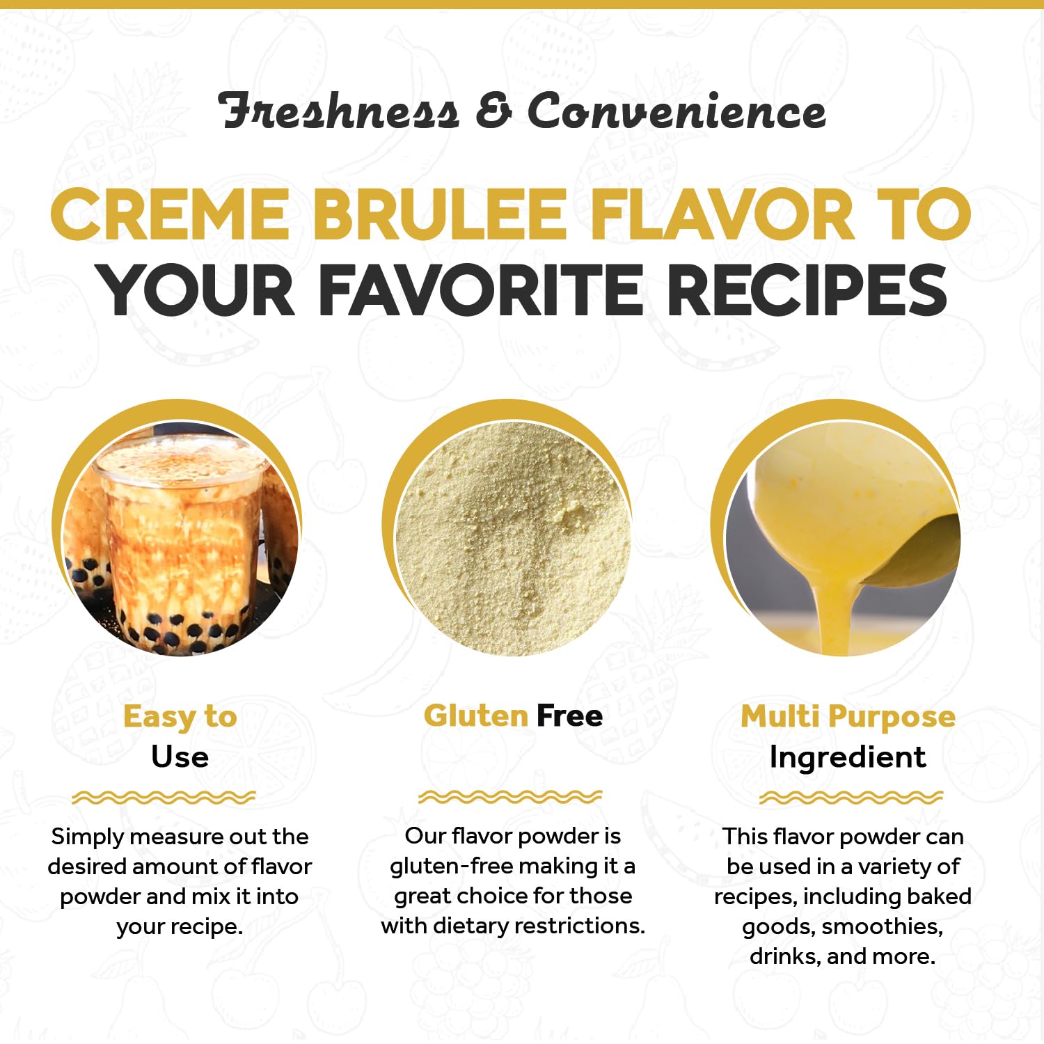 - Q: What recipes can I use Fanale Premium Creme Brulee Bubble Tea Flavoring Powder in? A: Fanale Premium Creme Brulee Flavoring Powder is a versatile ingredient that can be used in a variety of recipes, including baked goods, smoothies, desserts, and drinks. Whether you're making cakes, cookies, or boba milk tea, this flavoring powder will add a delicious nutty taste to your creations.