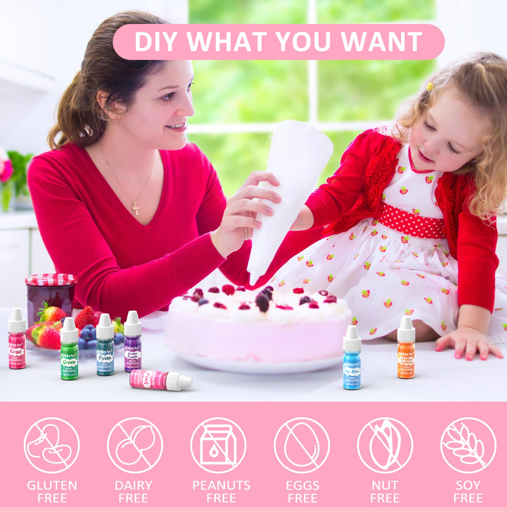Q: Is the Food Coloring Liquid safe for all dietary restrictions?A: Yes, the Food Coloring Liquid is made from food grade ingredients that are non-dairy, non-nut, and non-gluten, making it suitable for vegetarians and those with common dietary restrictions.