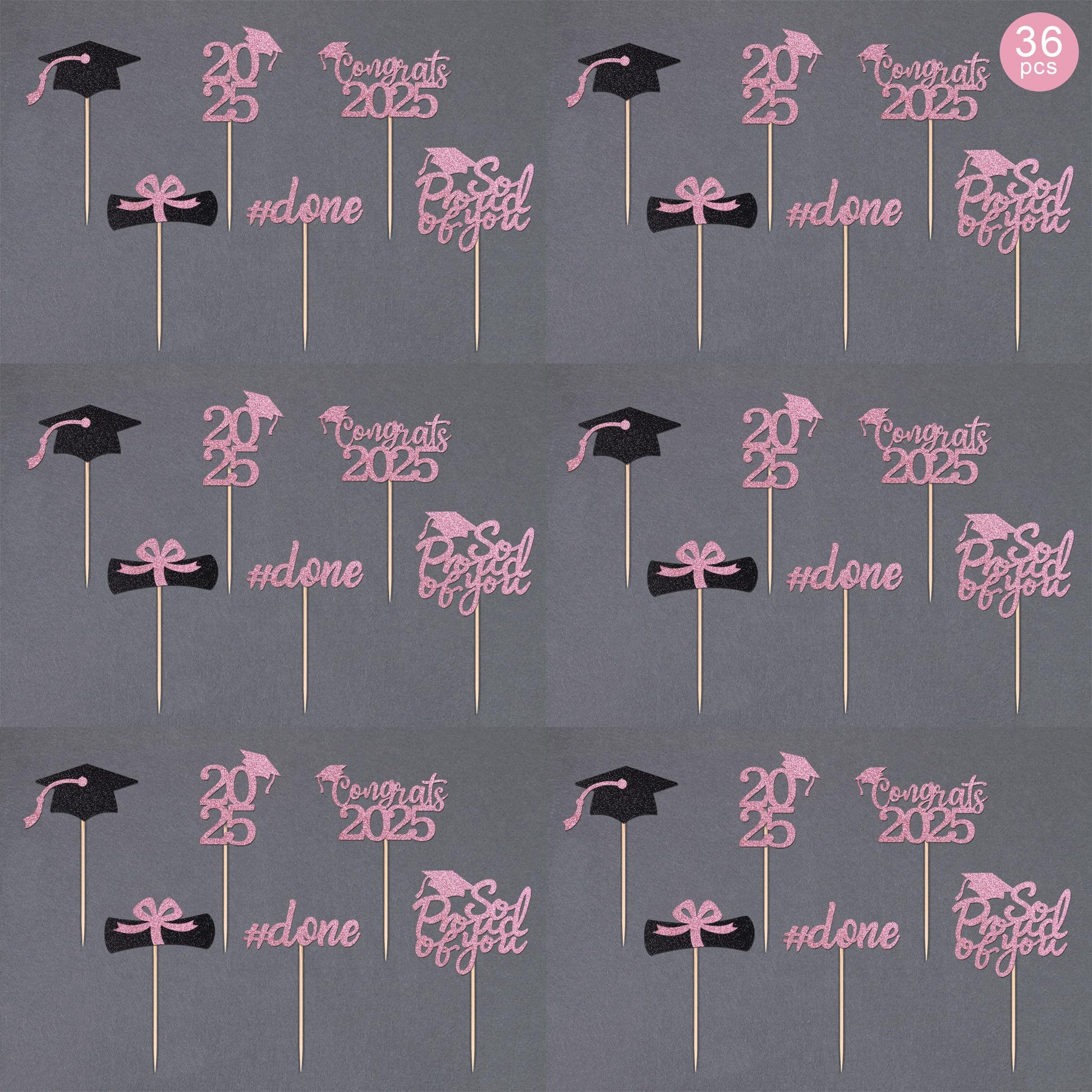 Q: Are the cupcake toppers already assembled?A: Yes, the package includes 36 pre-assembled Class of 2025 cupcake toppers, allowing you to easily insert them directly into your cake or desserts without any additional setup.