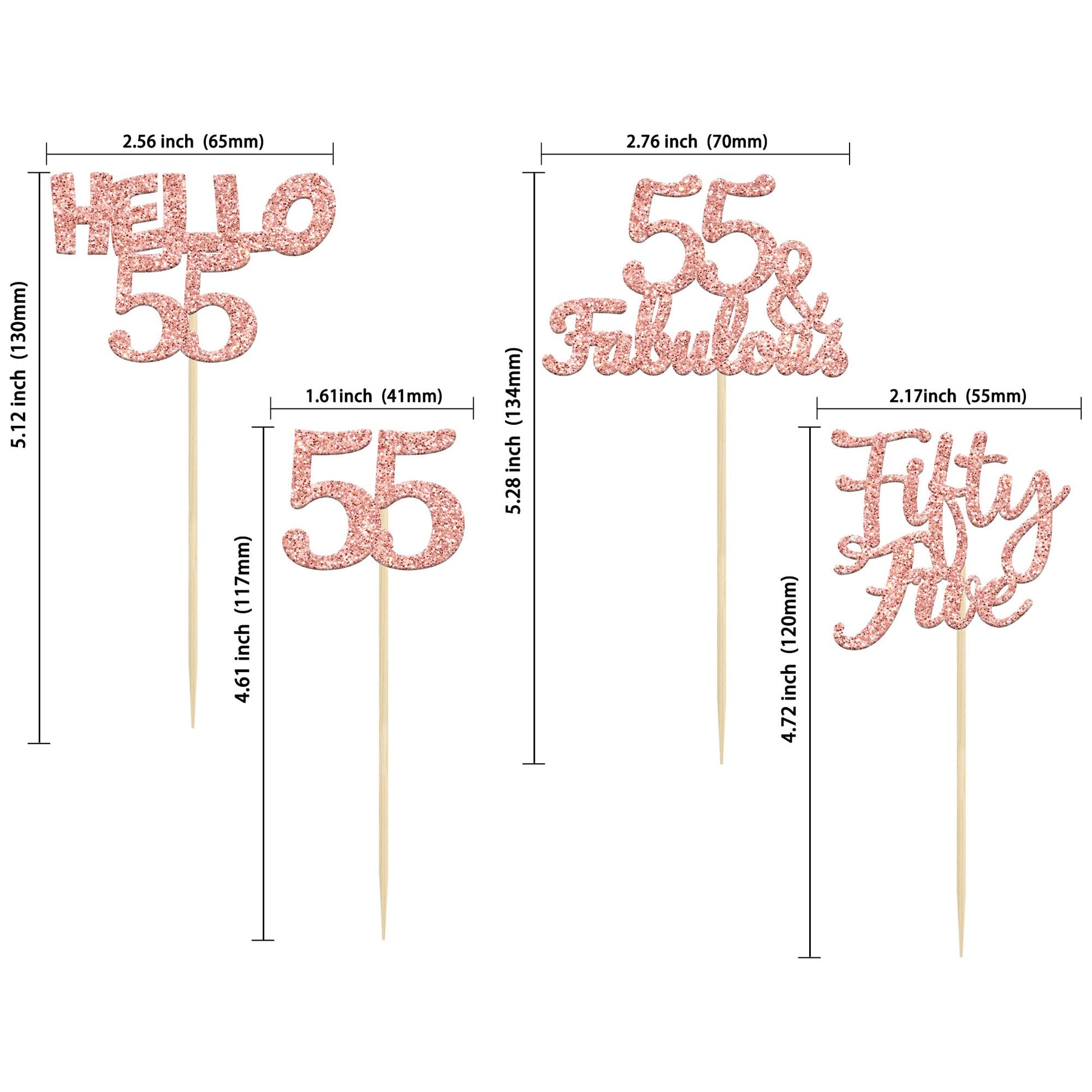 Q: What are the dimensions of the Gyufise 55th Birthday Cupcake Toppers?A: The Gyufise 55th Birthday Cupcake Toppers measure W 2.6 inches by H 4.8 inches, and they also come in a larger size of W 6.5 inches by H 12.2 inches, including the stick.