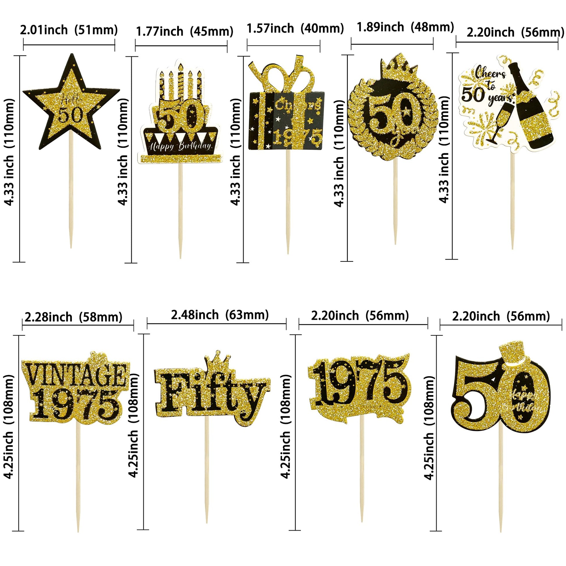 Q: What are the dimensions of the Gyufise 50th Birthday Cupcake Toppers?A: The Gyufise 50th Birthday Cupcake Toppers measure approximately 2.4 inches in width and 3.9 inches in height, including the stick.