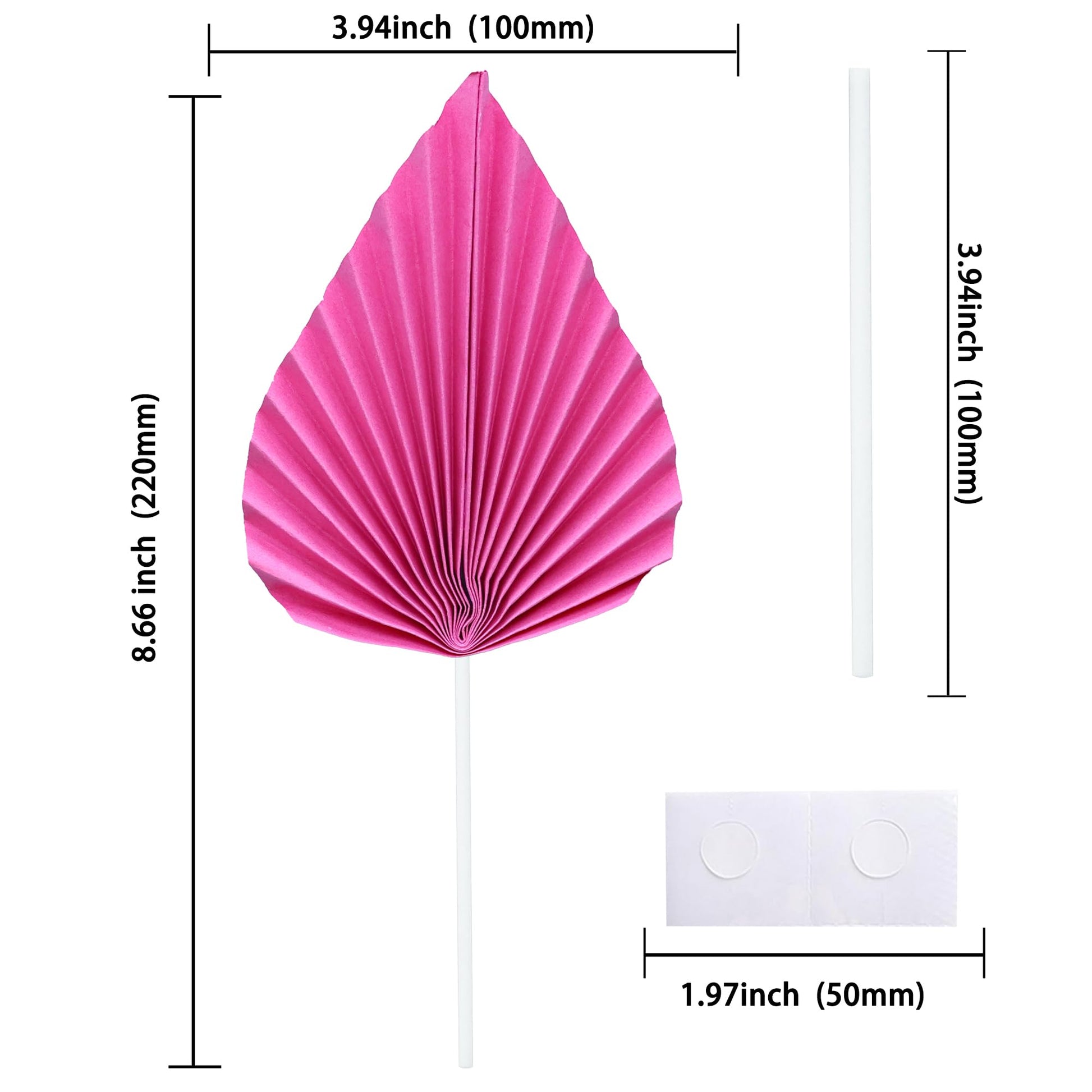 Q: What are the dimensions of the Gyufise Paper Palm Fan Cake Toppers?A: The Gyufise Paper Palm Fan Cake Toppers measure approximately W 4.7 inches x H 5.1 inches (W 12 cm x H 13 cm), excluding the stick.
