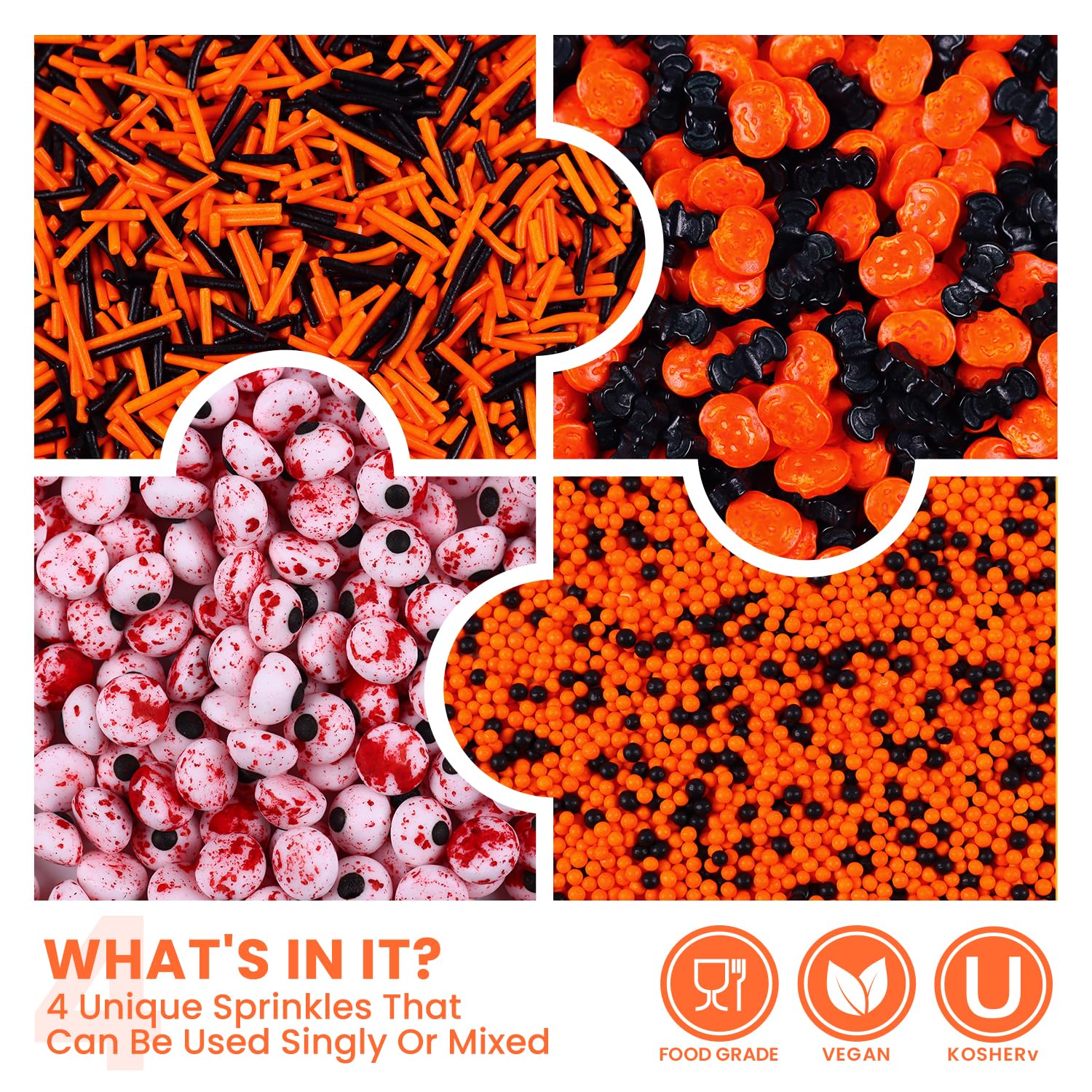 Q: What are the ingredients in these Halloween sprinkles?A: Our Halloween sprinkles are made from safe ingredients and are Kosher & Halal certified. They are gluten-free, nut-free, GMO-free, peanut-free, and soy-free, meeting food safety standards.