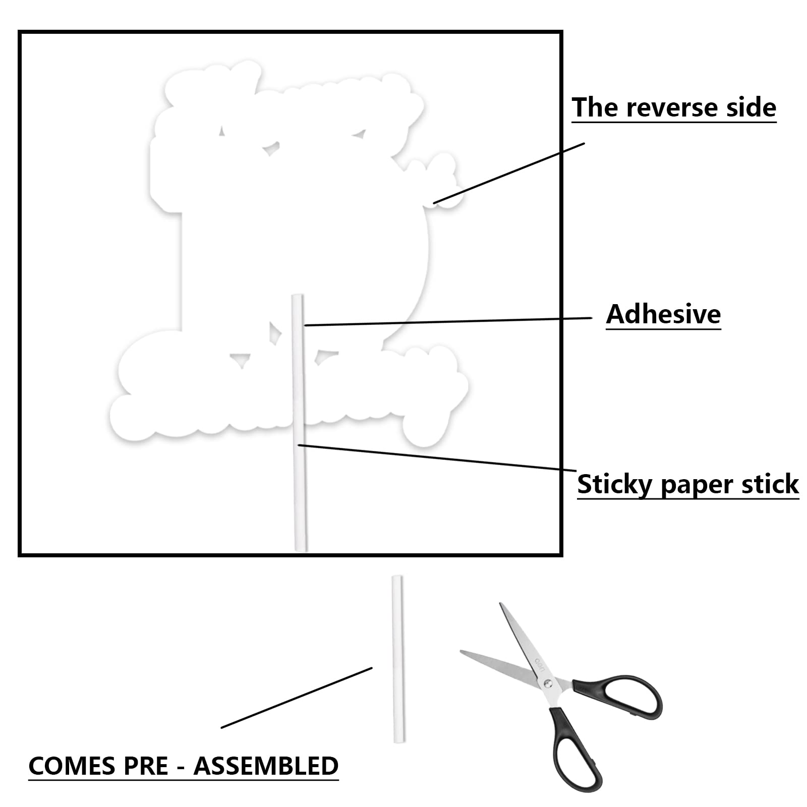Q: Does the cake topper require assembly?A: No assembly is required. The birthday cake topper comes pre-pasted with a sturdy stick, making it easy to use and saving you time during your party preparations.