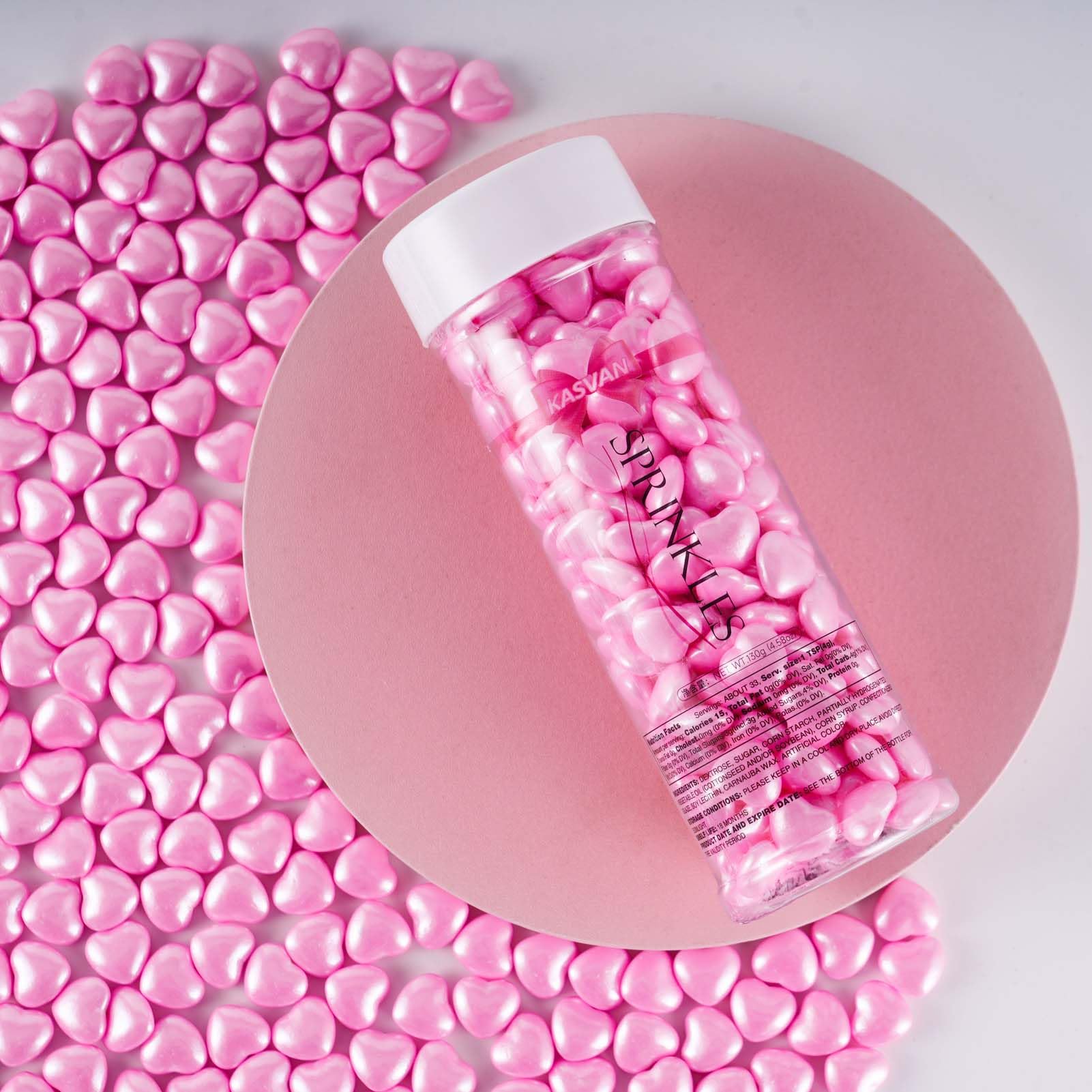 Q: What is the weight and packaging of the sprinkles?A: The Kasvan Pink Heart Shapes Sprinkles come in a bottle containing 130g (4.58 oz) of edible sugar pearls, providing plenty for multiple decorating needs.