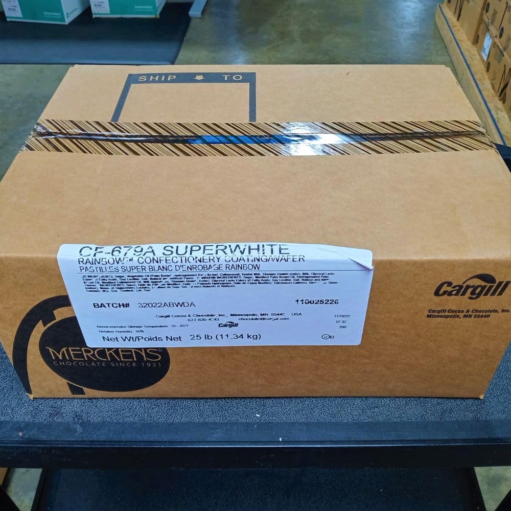 Q: What is the weight of the Merckens Super White Melting Wafers package?A: The package contains 10 pounds of Merckens Super White Melting Wafers, providing ample supply for various baking and confectionery projects.