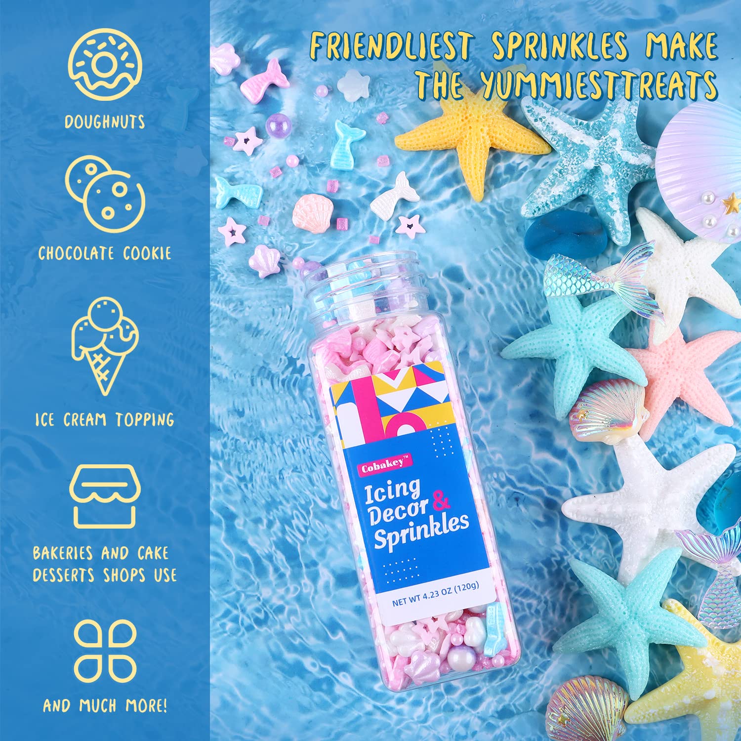 Q: What are Mermaid Sprinkles used for?A: Mermaid Sprinkles are perfect for decorating cakes, cupcakes, cookies, ice cream, and candies. Their unique ocean-themed design makes them ideal for parties and celebrations, such as birthdays, baby showers, and weddings.