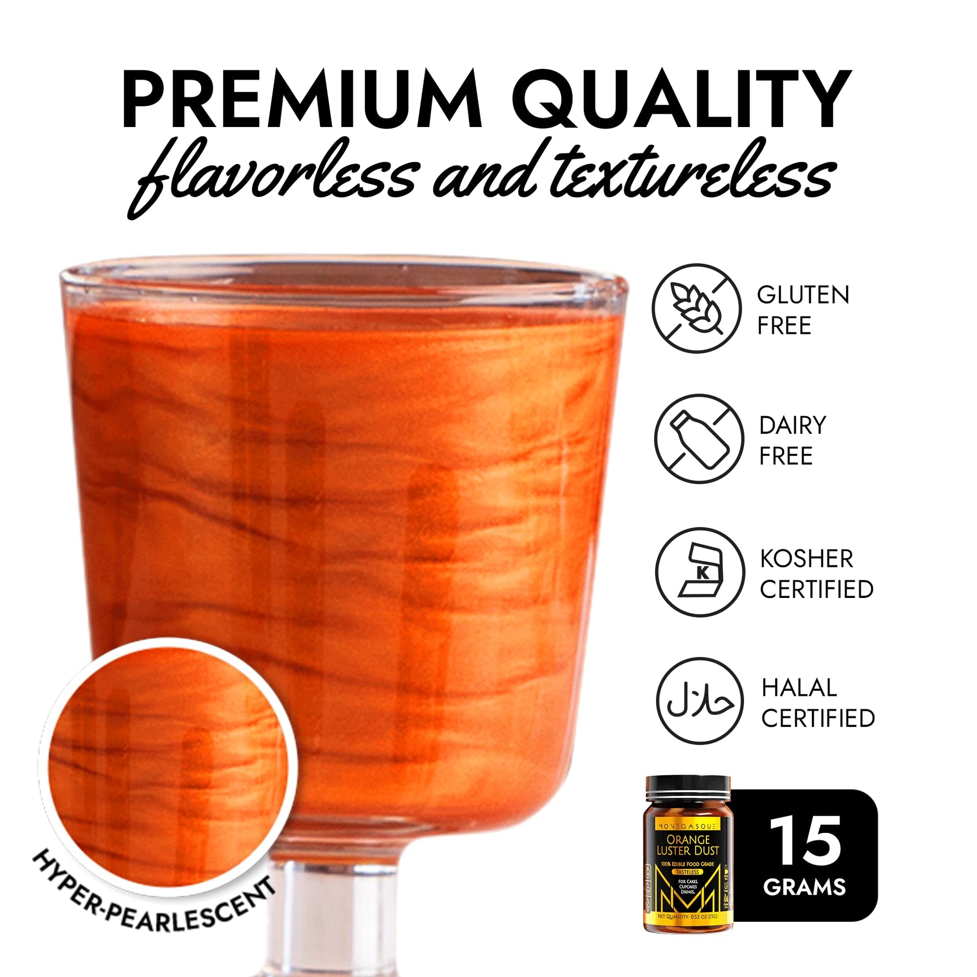 - Q: What is MONÉGASQUE Orange Luster Dust and how is it used? A: MONÉGASQUE Orange Luster Dust is an edible glitter designed for enhancing the appearance of desserts and drinks. It can be used to add a shimmering, pearlescent finish to cakes, cupcakes, cookies, chocolates, and cocktails. Simply sprinkle or dust it onto your creations for a vibrant and eye-catching effect.