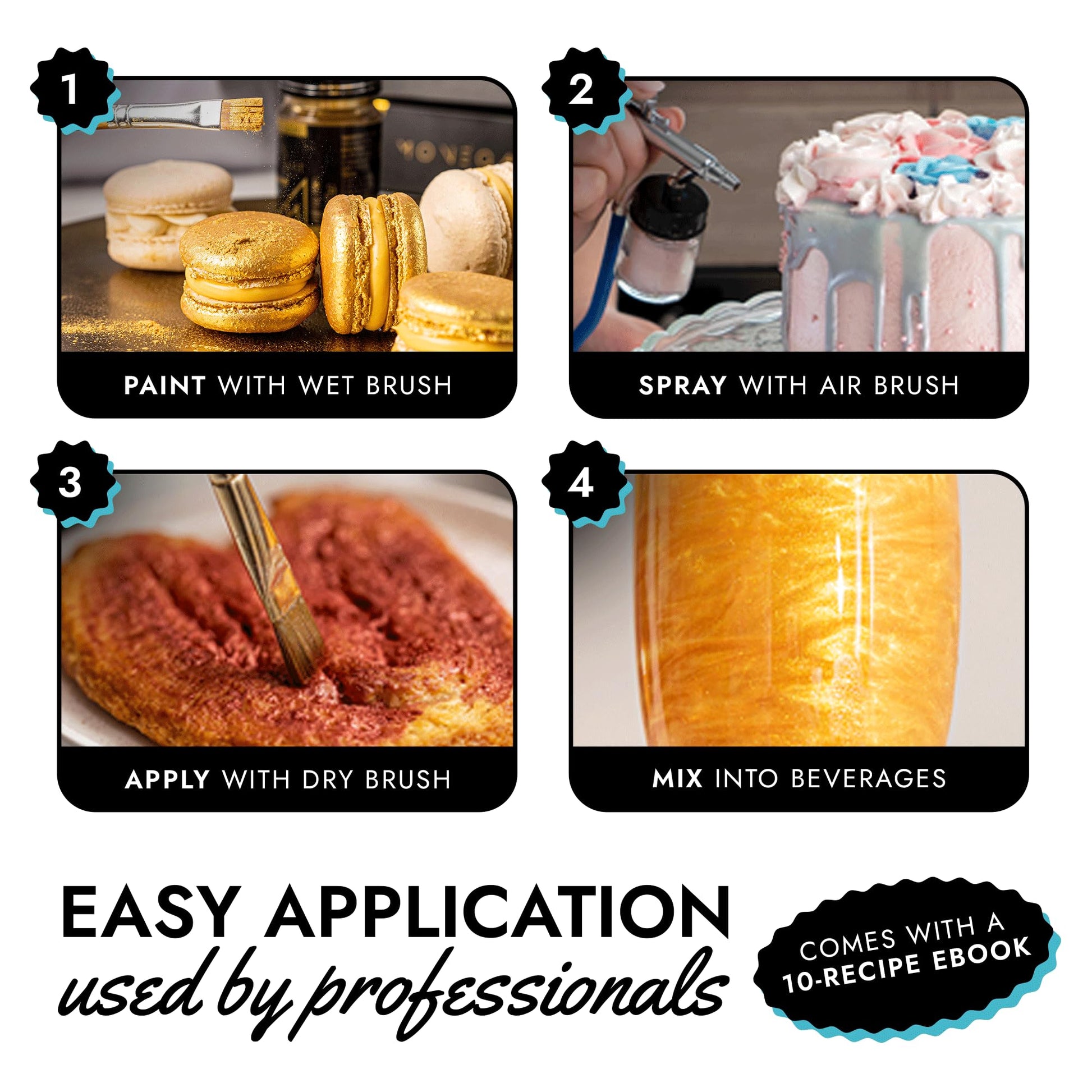 Q: How do I use the teal blue luster dust?A: Using MONÉGASQUE Edible Glitter is easy. You can apply it with a wet brush, airbrush, or dry brush. Additionally, it can be mixed into beverages for a sparkling effect, allowing for versatile use in both drinks and food.