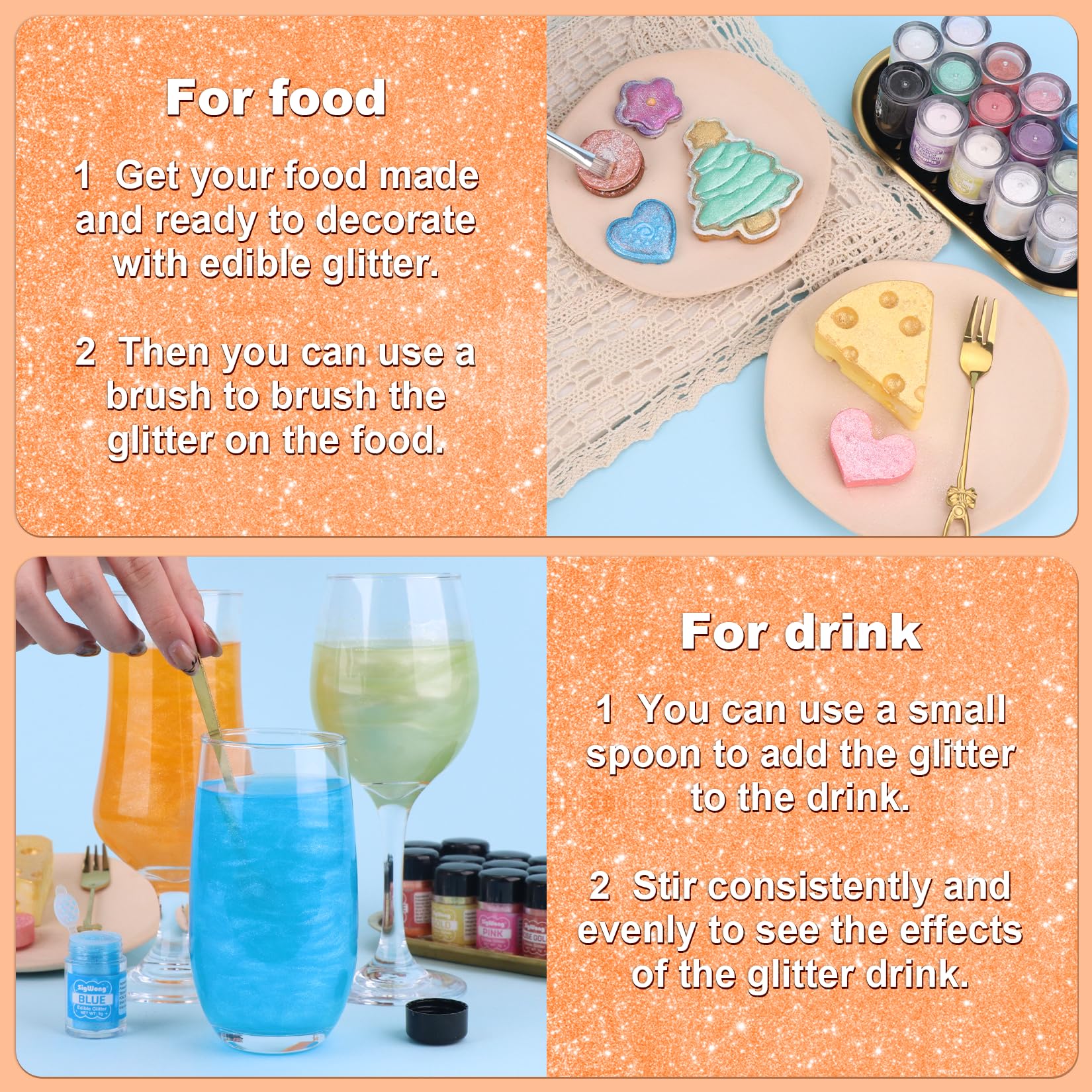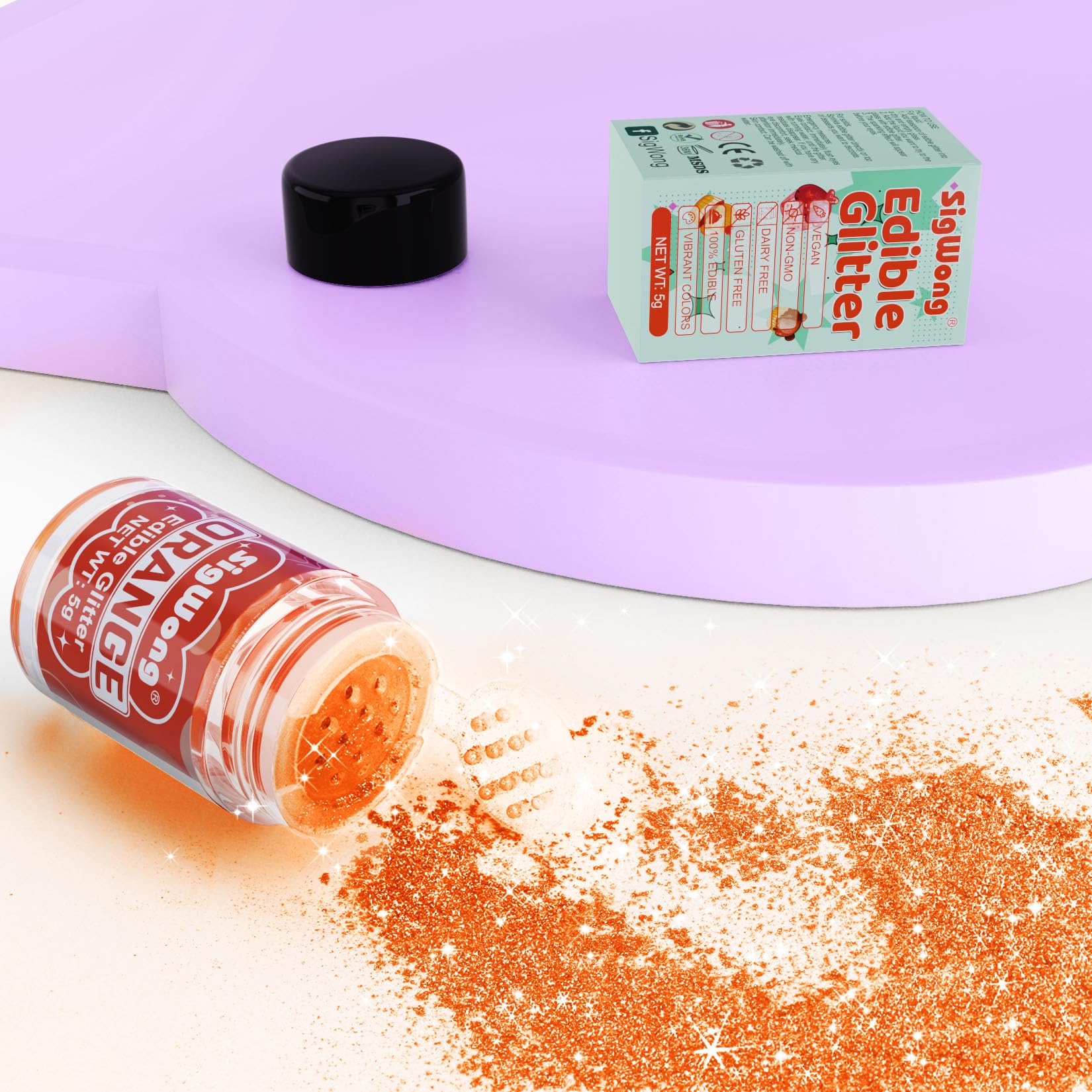 Q: How can I use the edible glitter in my baking or drinks?A: The Orange Edible Glitter is easy to use! You can sprinkle it directly onto your cakes, cookies, cupcakes, or even drinks like cocktails and sodas to add a beautiful shimmering effect.
