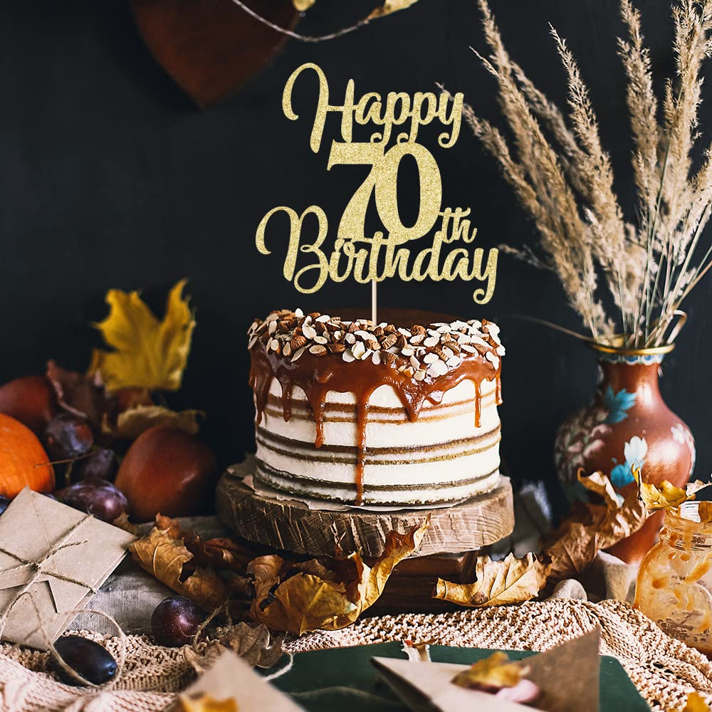 Q: What size cake is the topper suitable for?A: The PALASASA Gold Happy 70th Birthday Cake Topper is ideal for cakes that are 8 to 10 inches in diameter, making it perfect for a variety of birthday cakes.