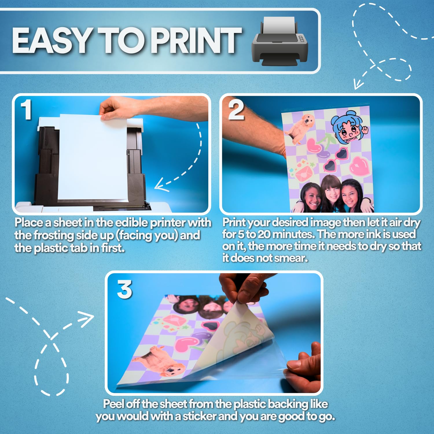 Q: Can I print on these frosting sheets with any printer?A: Yes, these frosting sheets are compatible with all common wide format edible paper printers, allowing you to print large, high-resolution images in vivid colors.