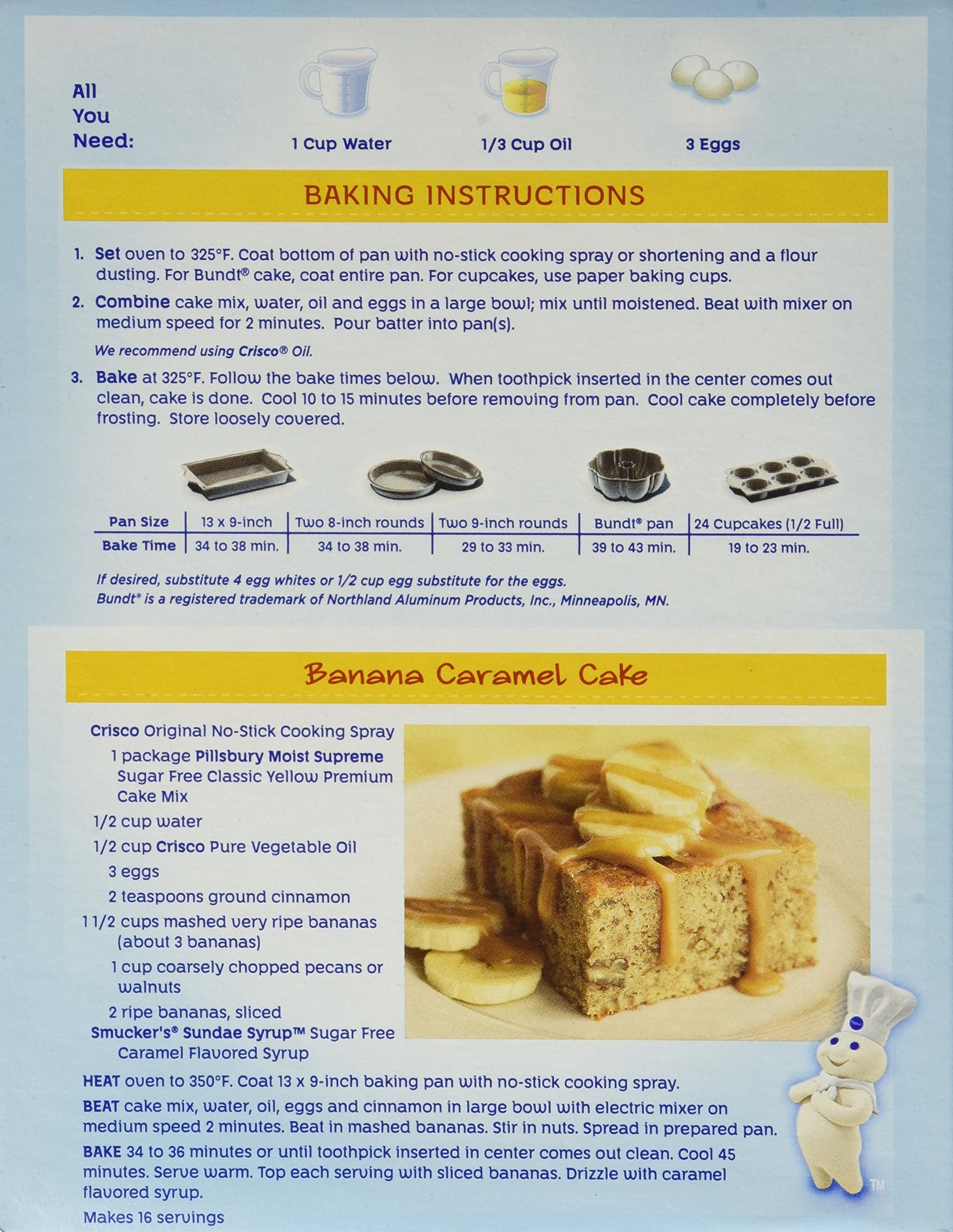 Pillsbury Moist Supreme Classic Yellow Sugar Free Cake Mix is sweetened with Splenda, so if you are trying to avoid sugar this is the cake mix for you. This Pillsbury Cake Mix, 16 oz, can be made into cupcakes, a desert for someone special or for a party. Using the moist supreme cake mix means your cake will be ready in less than an hour.
