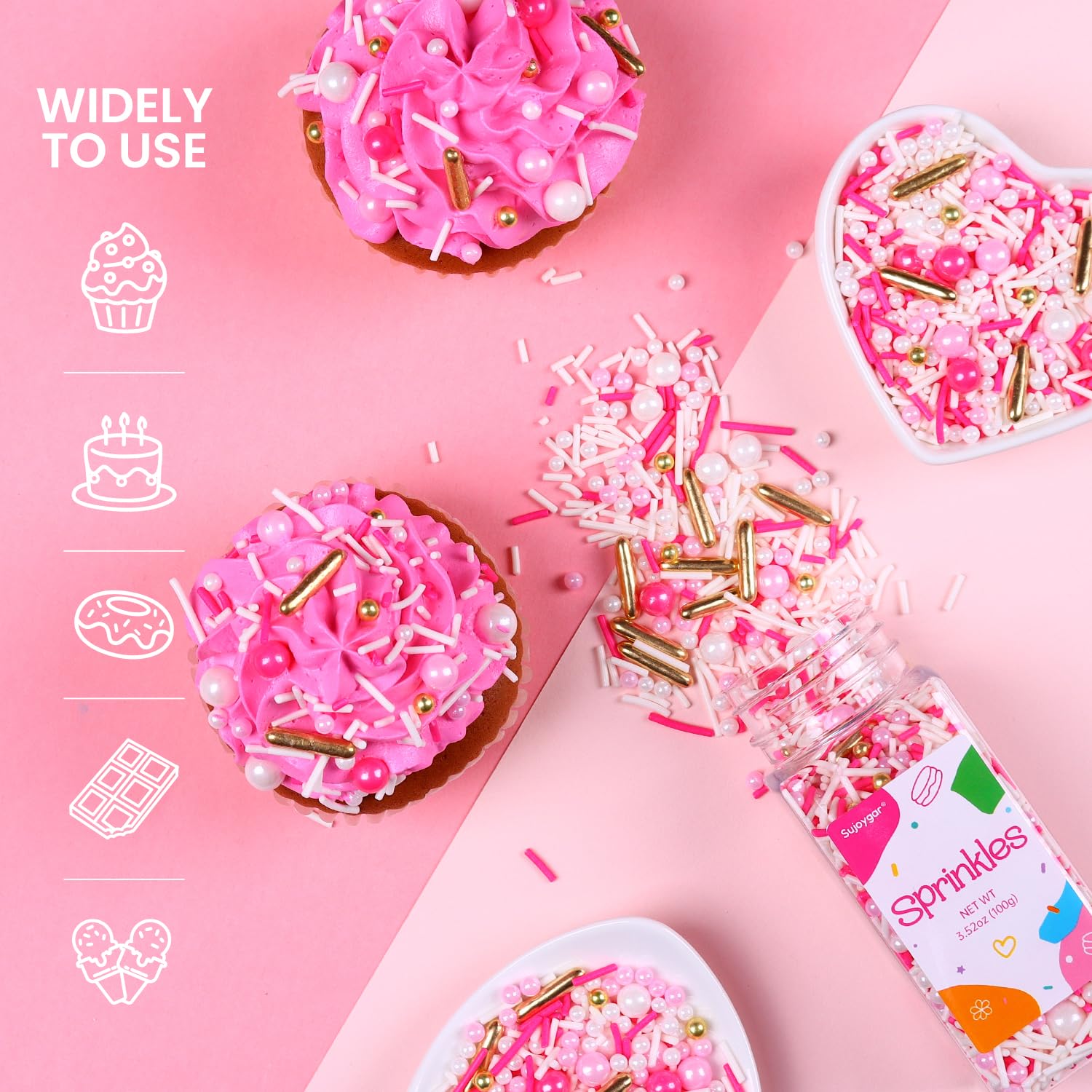 Sujoygar Pink Sprinkles Are Non Toxic. Use Pink And Gold Metallic Sprinkles To Decorate Cakes, Cupcake Or Cookies After Baking To Avoid Melting. Use Raw Materials That Meet Food Safety Standards. In Which Pink Gold Sprinkles Are Decorative Use Only. Take An Appropriate Amount Of Pink Pearl Sprinkles To Decorate The Cake, Cupcakes, Cookies, Chocolate, Ice Cream, Donuts And Desserts, Etc. Make The Food More Halloween Christmas Wedding Party Birthday Valentines Festive.