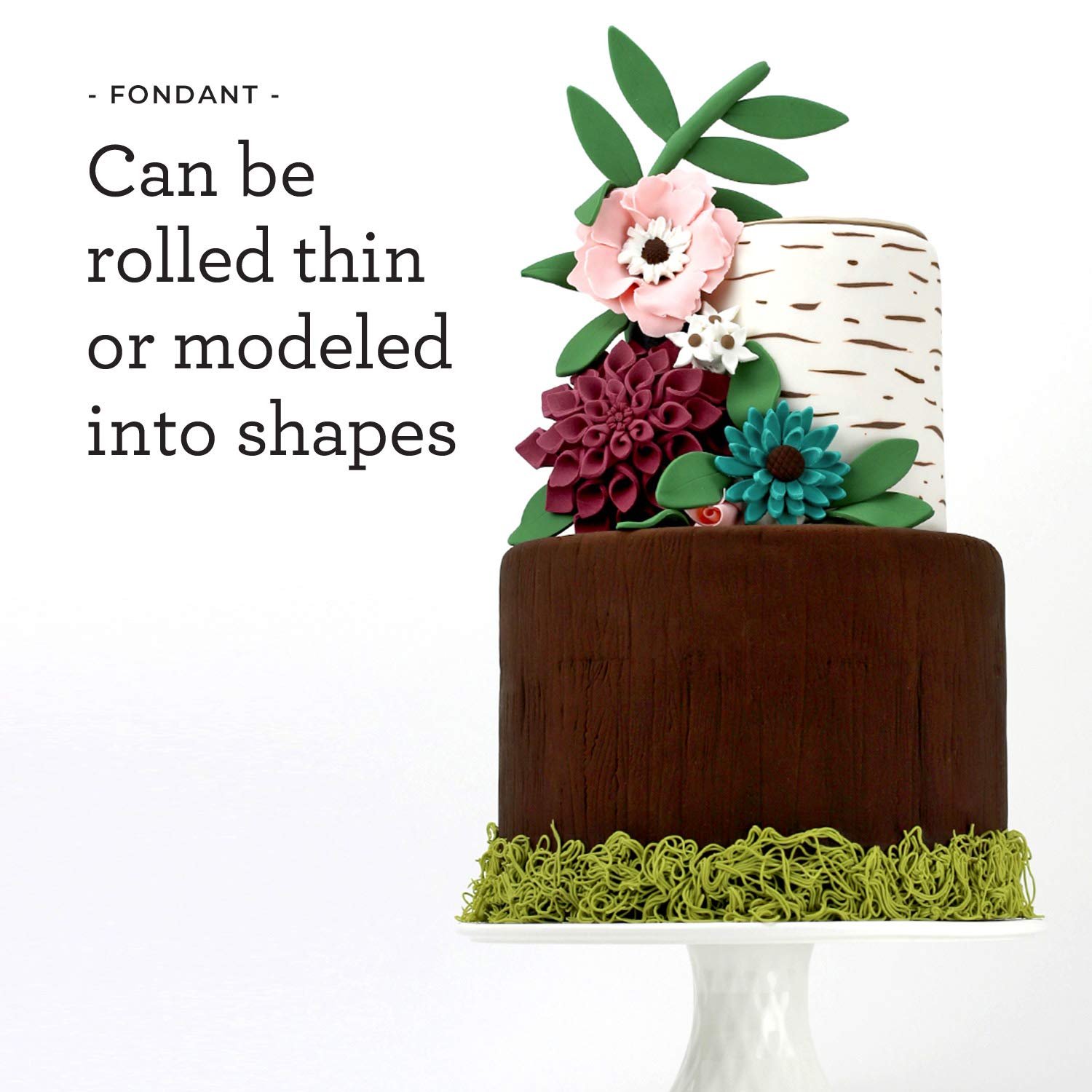 THE #1 CHOICE OF CAKE ARTISTS AROUND THE WORLD Satin Ice is a premium quality fondant for creating a smooth, elegant finish for wedding, birthday, novelty, and special-occasion cakes. Additionally, it is used as a modeling paste to create decorative borders, flowers, figurines, drapes & bows. Blow your friends and clients away with unbelievable designs and artwork for those special occasions. Satin Ice is the choice of professional worldwide, yet easy enough to use for the home baker. Satin Ice has established itself as an industry leader, not only for its premium quality and workability, but also for its great texture, taste, and assortment of colors! We pride ourselves in working closely with professional cake artists to develop a deep understanding of the craft and create a product that satisfies the demands of the best cake decorators, hobbyists, and beginners. Satin Ice is the professionals choice for premium quality and creativity and offers many favored attributes like gluten free, dairy free, nut free, and Kosher Pareve. HANDLING PROCEDURES Crumb coat cake with a thin, smooth layer of buttercream. Refrigerate or set aside. Keep hands, tools, and work surface completely dry. Moving quickly, knead fondant in small quantities and combine for final knead. Immediately roll to 1/8 inch (3mm) on a non-stick surface (e.g. baking mat). Use a thin dusting of cornstarch or confectioners sugar if desired. Drape over cake and adhere. Trim excess and decorate as desired. STORAGE Unused fondant should be resealed quickly and wrapped airtight. Trimmings stored separately. Store at ambient temperature, away from direct light. Chocolate Fondant should be refrigerated after opening.