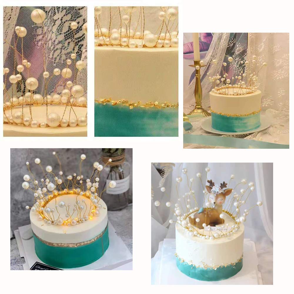 Q: What materials are used in the construction of this cake topper?A: This cake topper is made from glittering metal gold wire and white artificial pearls, providing an elegant and shiny appearance for any celebration.