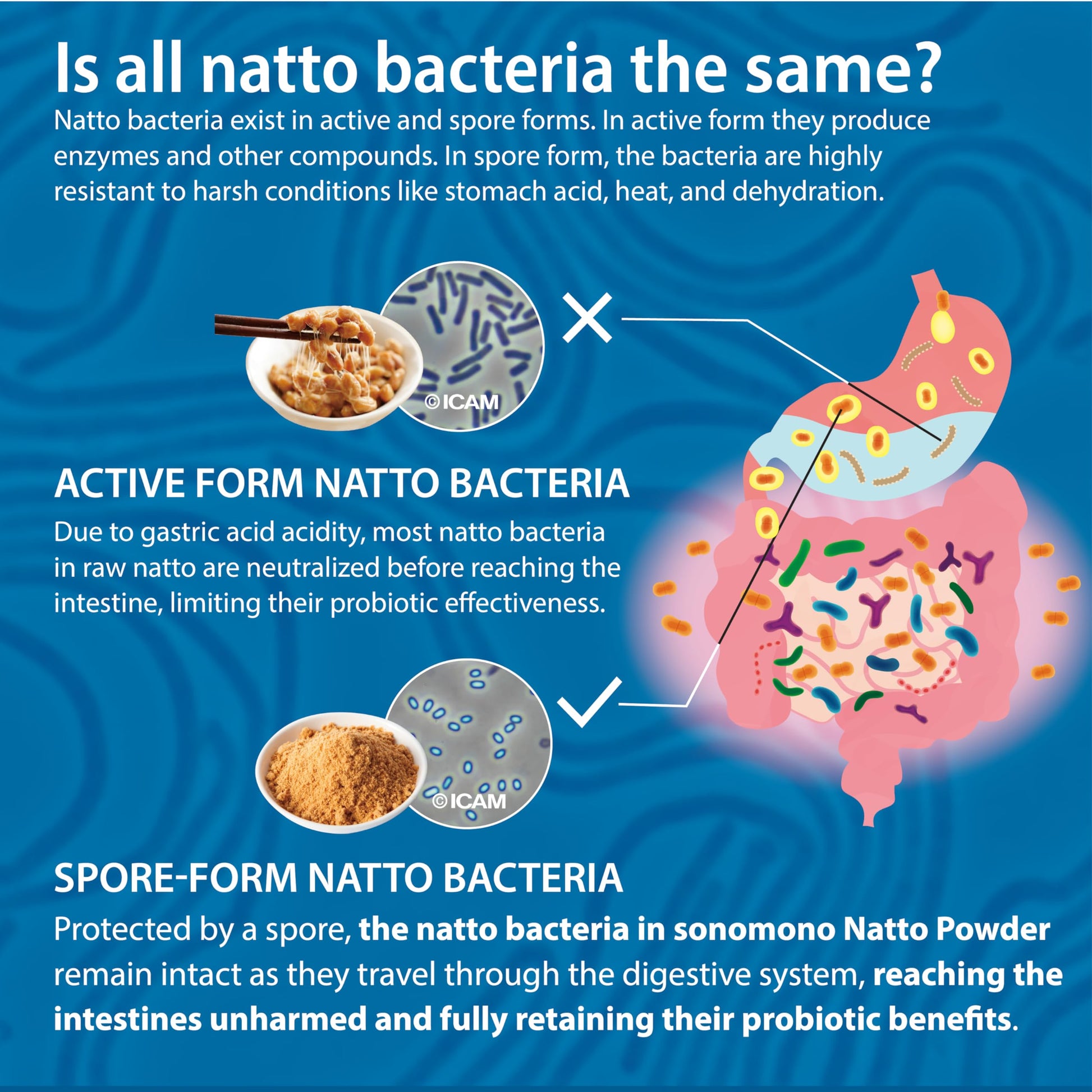 Q: What makes Sonomono Natto Powder different from raw natto?A: Sonomono Natto Powder contains probiotics in spore form, which are resistant to heat and acidity, ensuring more nutrients and probiotics per serving compared to raw natto. It offers the same health benefits with a less pungent aroma.