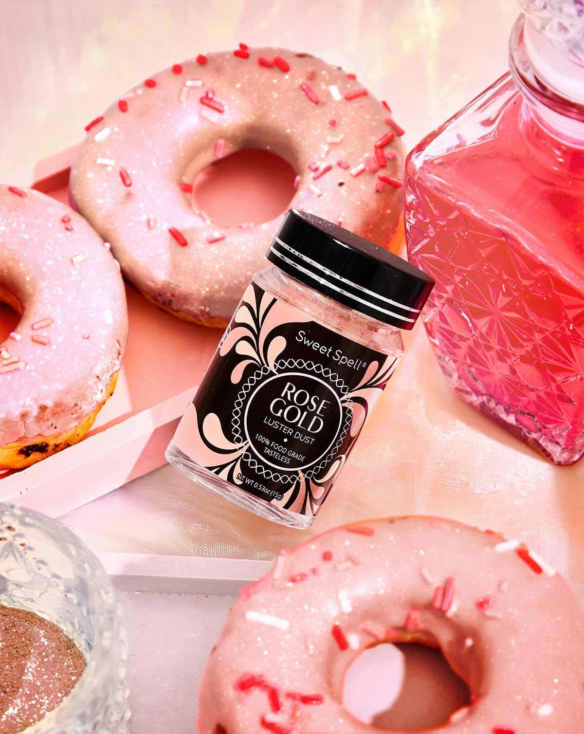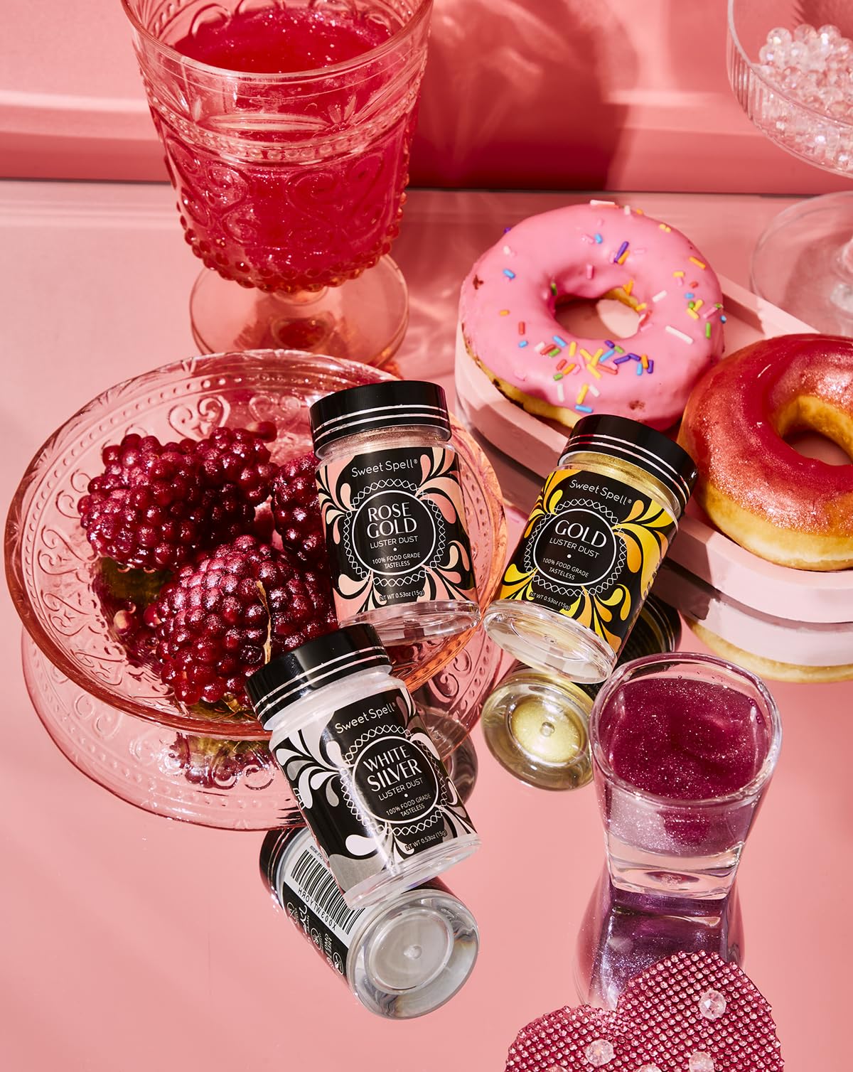 Q: How can I use Sweet Spell Luster Dust in my recipes?A: You can use Sweet Spell Luster Dust to add a shimmering finish to cakes, cupcakes, donuts, chocolates, and even beverages like cocktails and drinks. Simply sprinkle it on your creations for a magical touch.
