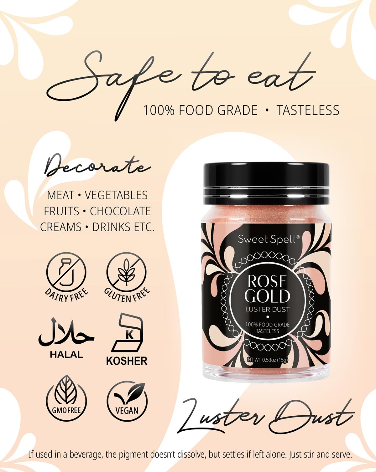Q: Is the luster dust suitable for vegan and gluten-free diets?A: Yes, Sweet Spell Luster Dust is vegan, gluten-free, nut-free, dairy-free, Halal, and Kosher certified, making it suitable for a wide range of dietary preferences.