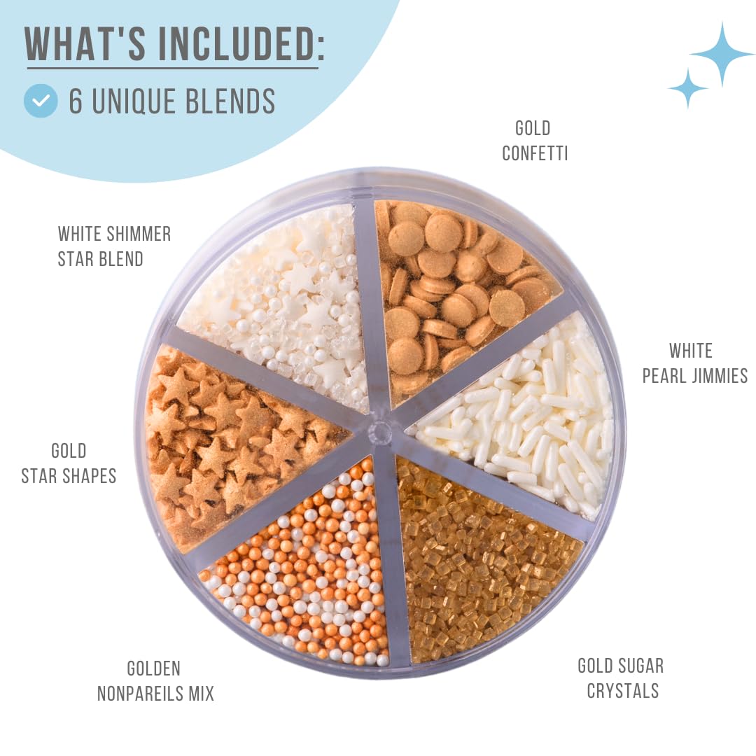 - Q: Are the sprinkles in individual cells easy to use? A: Yes, each jar of Sweets Indeed Gold Sprinkles features individual cells for different types of sprinkles, including pearlized sugar, confetti quins, nonpareils, and jimmies. This design allows for easy mixing and matching, so you can apply just the right amount of each sprinkle for your baking needs.