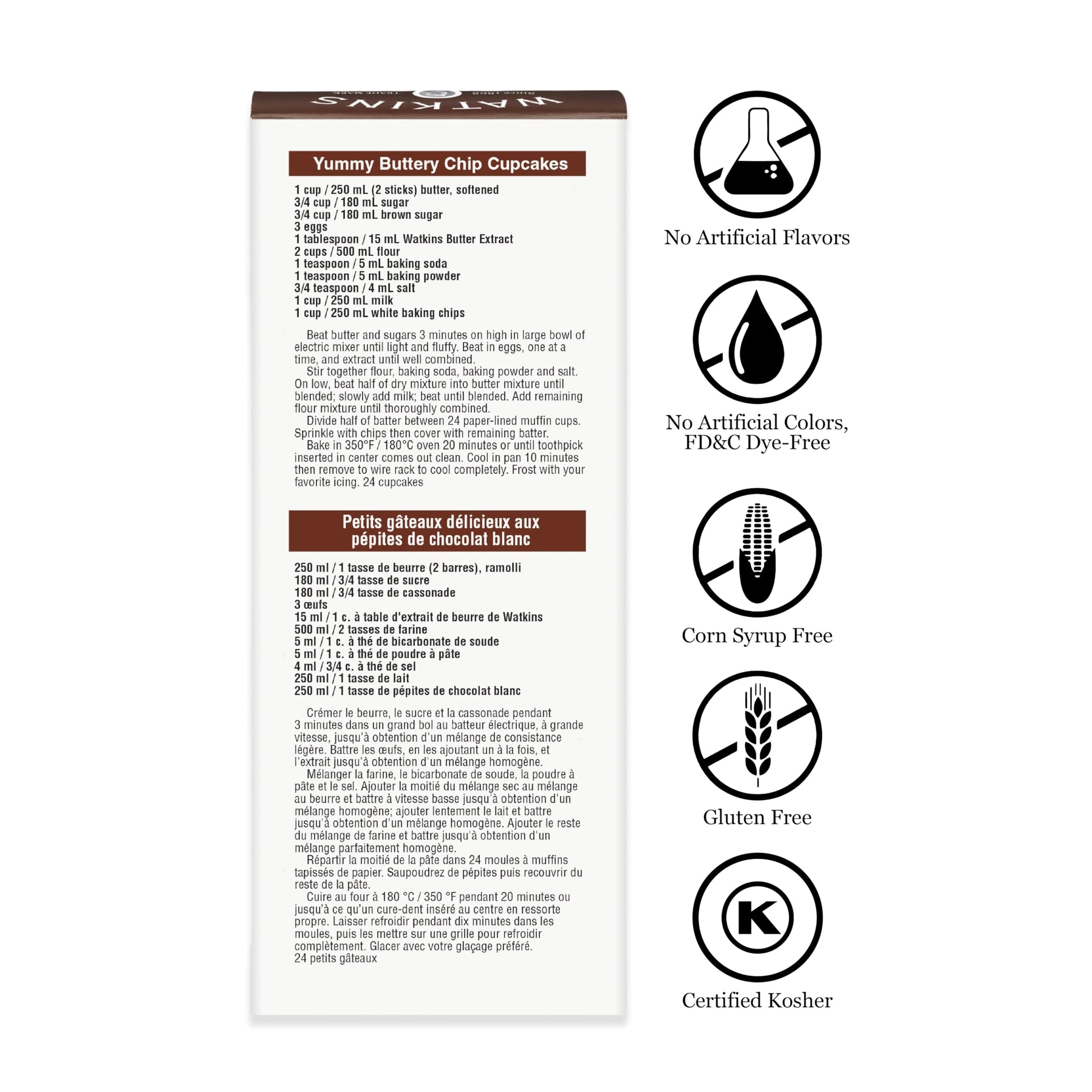 Q: Are there any artificial ingredients in Watkins Butter Extract?A: No, Watkins Butter Extract contains no artificial colors or flavors. All ingredients are naturally derived, ensuring a pure and authentic taste.