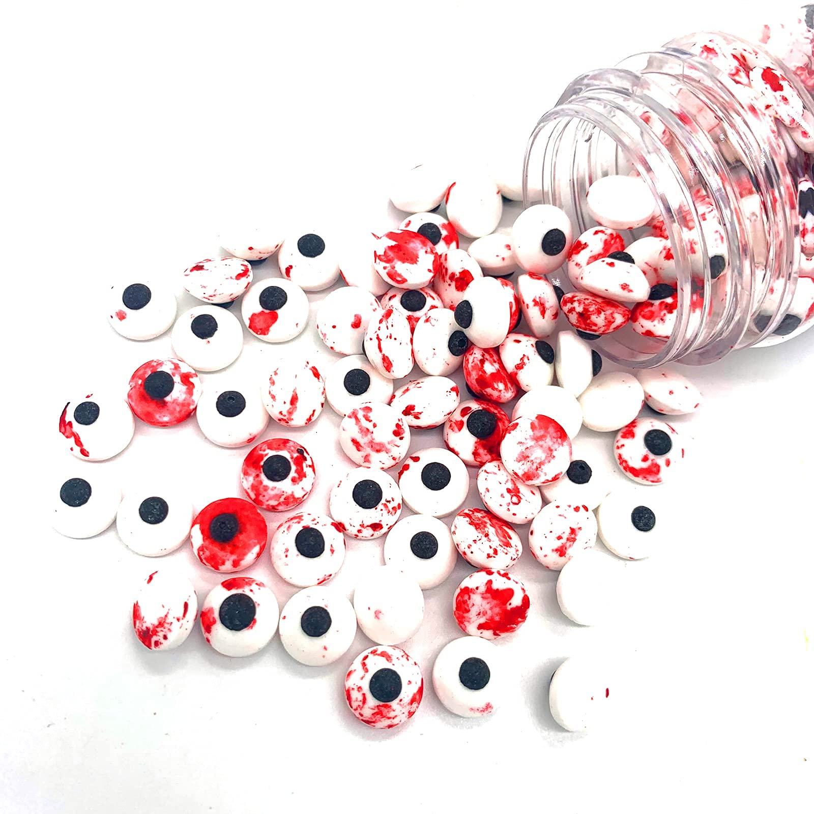 Q: What are the dimensions of the Weraru Candy Eyeballs?A: The Weraru Small Candy Bloody Red Eyeballs are approximately 1 cm (0.39 inches) in diameter, making them the perfect size for cupcake toppers and cookie decorations.