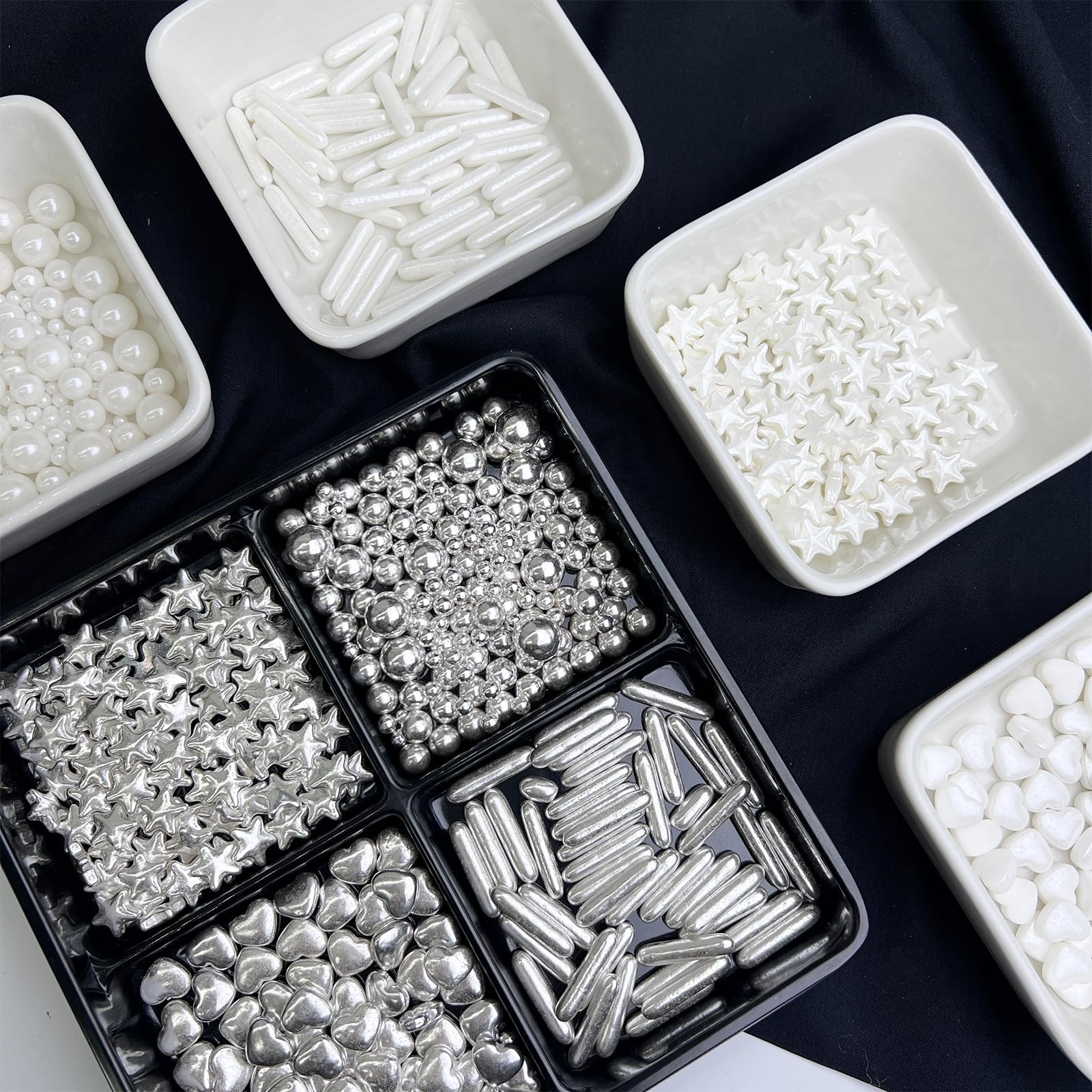 Q: Can these sprinkles be used for different types of desserts?A: Yes, these white and sliver sprinkles are versatile and can be used for decorating cakes, cupcakes, cookies, and even as toppings for ice cream.