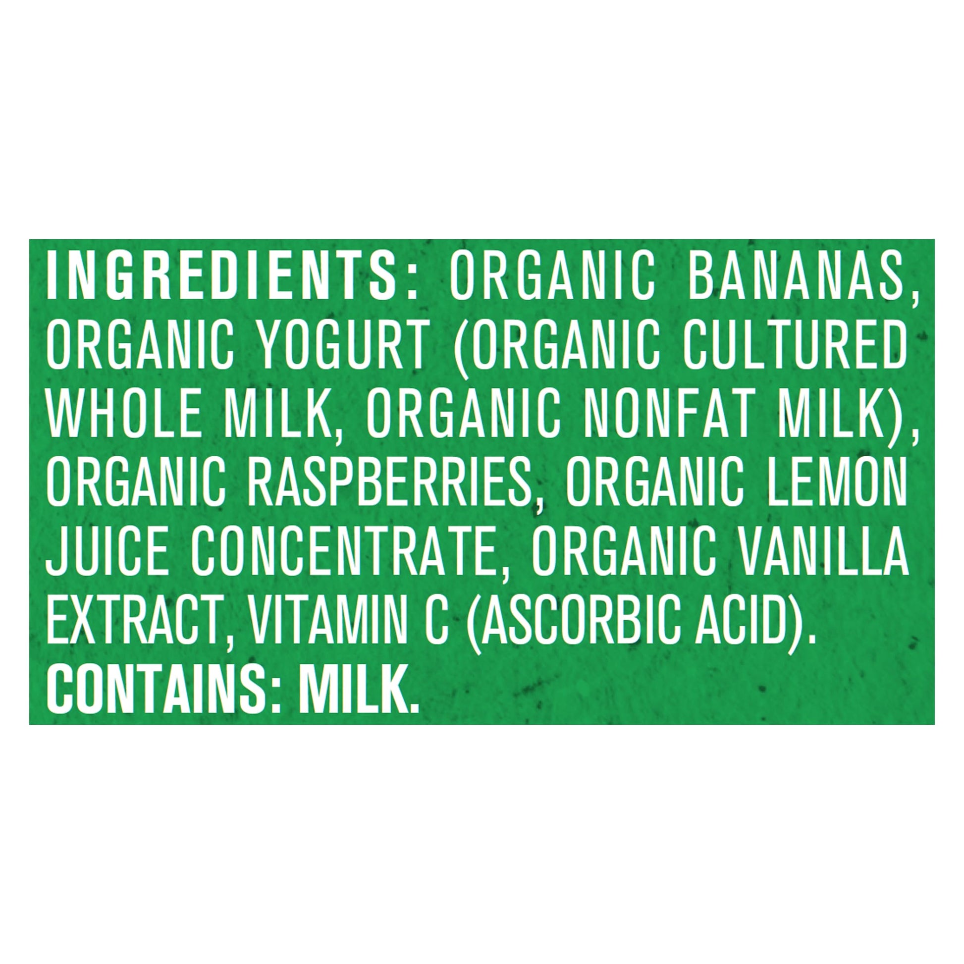 Q: What ingredients are in Gerber Organic Baby Food Pouches?A: Gerber Organic Baby Food Pouches contain real fruits like bananas and raspberries, along with yogurt and vanilla, with no added sweeteners, starches, artificial flavors, or colors. This ensures a wholesome and nutritious option for your toddler.