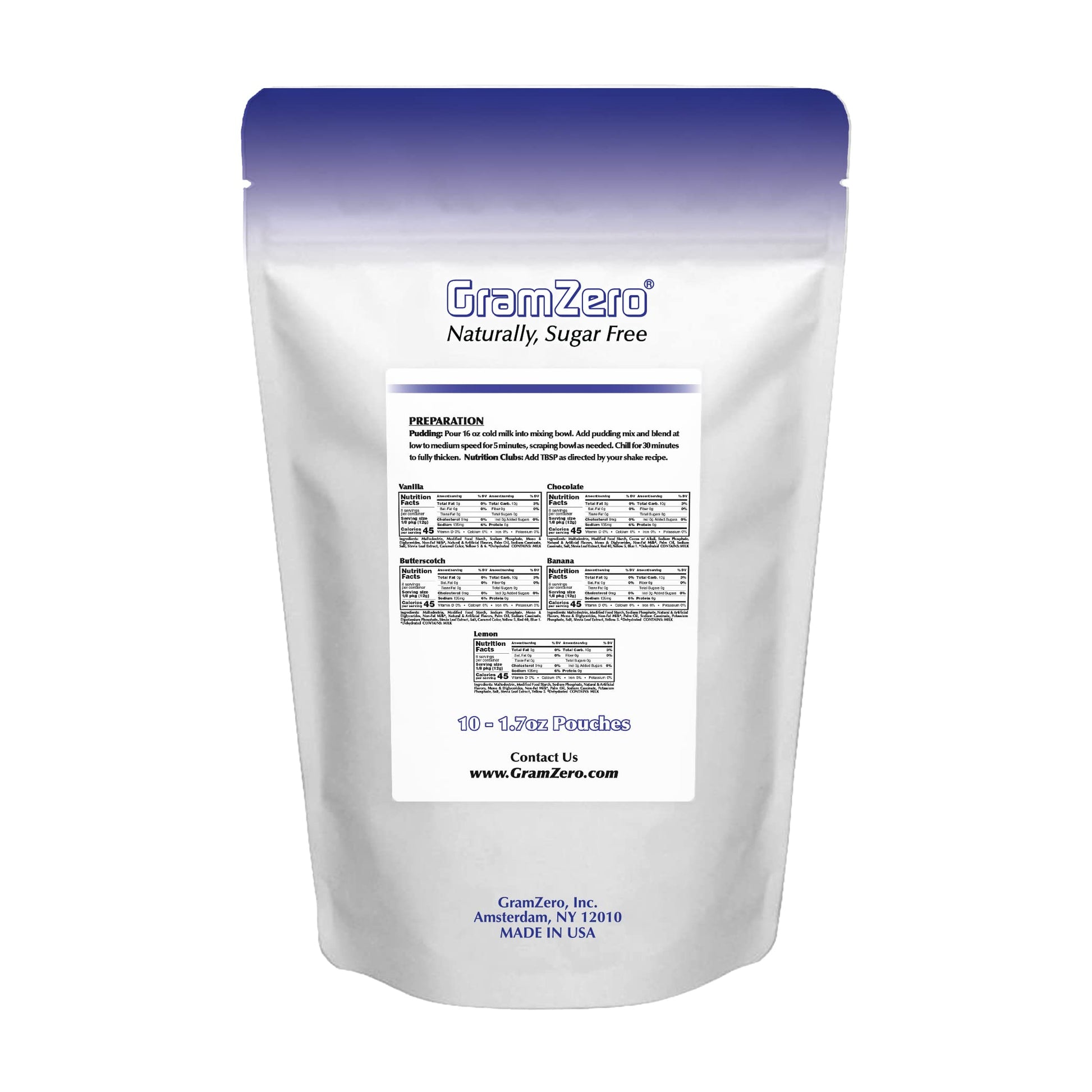 Gramzero Naturally, Sugar Free Pudding Mix Is Sweetened With Organic Stevia For The Best Easy Low Carb Dessert! Each Sugar Free Instant Pudding Mix Tastes Just Like The Sugar Sweetened Puddings, However With No Unwanted Aftertaste, No Sugar Alcohols And No Artificial Sweeteners!Looking For Super Easy Low Carb Desserts? Youve Found The Best Stevia Pudding Mix That Makes A Quick Low Carb Dessert That Actually Tastes Good! Gramzero Products Support A Low Carb Diet And This Sugar Free Pudding Mix Makes The Best Sugar Free Dessert That Is Definitely A Low Carb Treat!Our Low Carb Pudding Mixes Are Also Perfect To Flavor Nutrition Shakes! Build Your Best Meal Replacement Shakes With Gramzero Sugar Free Pudding Mix Flavors, You Wont Be Disappointed! At Gramzero, We Are A Family Owned And Operated Company. Our Mission Is To Provide Easy To Use, Great Tasting And Naturally, Sugar Free Products That Help Encourage Healthy Living! All Gramzero Products Are Sugar Free And Low Or Zero Calorie, Sweetened Naturally Only With Organic Stevia!Thank You So Much For Supporting Our Business! The Gramzero Familyinstructions - Easy Low Carb Dessert: Pour 2 Cups (16 Fl Ounces) Of Cold Dairy Milk Into A Mixing Bowl And Add The Sugar Free Pudding Mix Pouch Contents. Blend On Low To Medium Speed With An Electric Hand Mixer For 4-5 Minutes, Scraping Sides Of Bowl As Mixing. Place In The Fridge To Chill For 30 Minutes To 1 Hour To Fully Thicken, Then Enjoy! As A Sugar Free Pudding Mix, A 1.7 Ounce Pouch Makes Approximately 4 - 4 Ounce Servings.Instructions - Nutrition Club Shake: Use As Directed By Your Club'S Meal Replacement Shake Recipe.