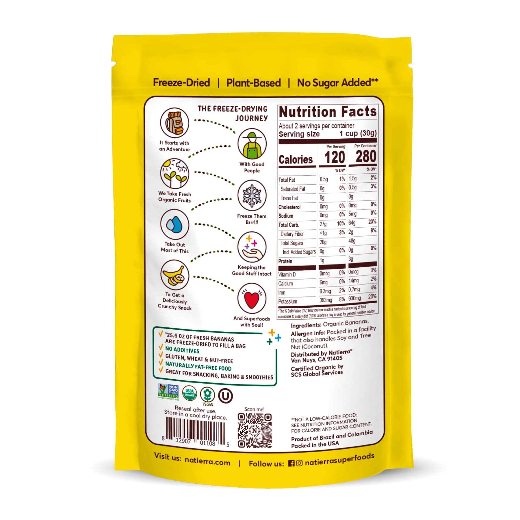 Q: What are the ingredients in NATIERRA Organic Freeze-Dried Bananas?A: NATIERRA Organic Freeze-Dried Bananas are made from 100% USDA Certified Organic bananas, ensuring that you get a pure and natural fruit snack without any additives or preservatives.