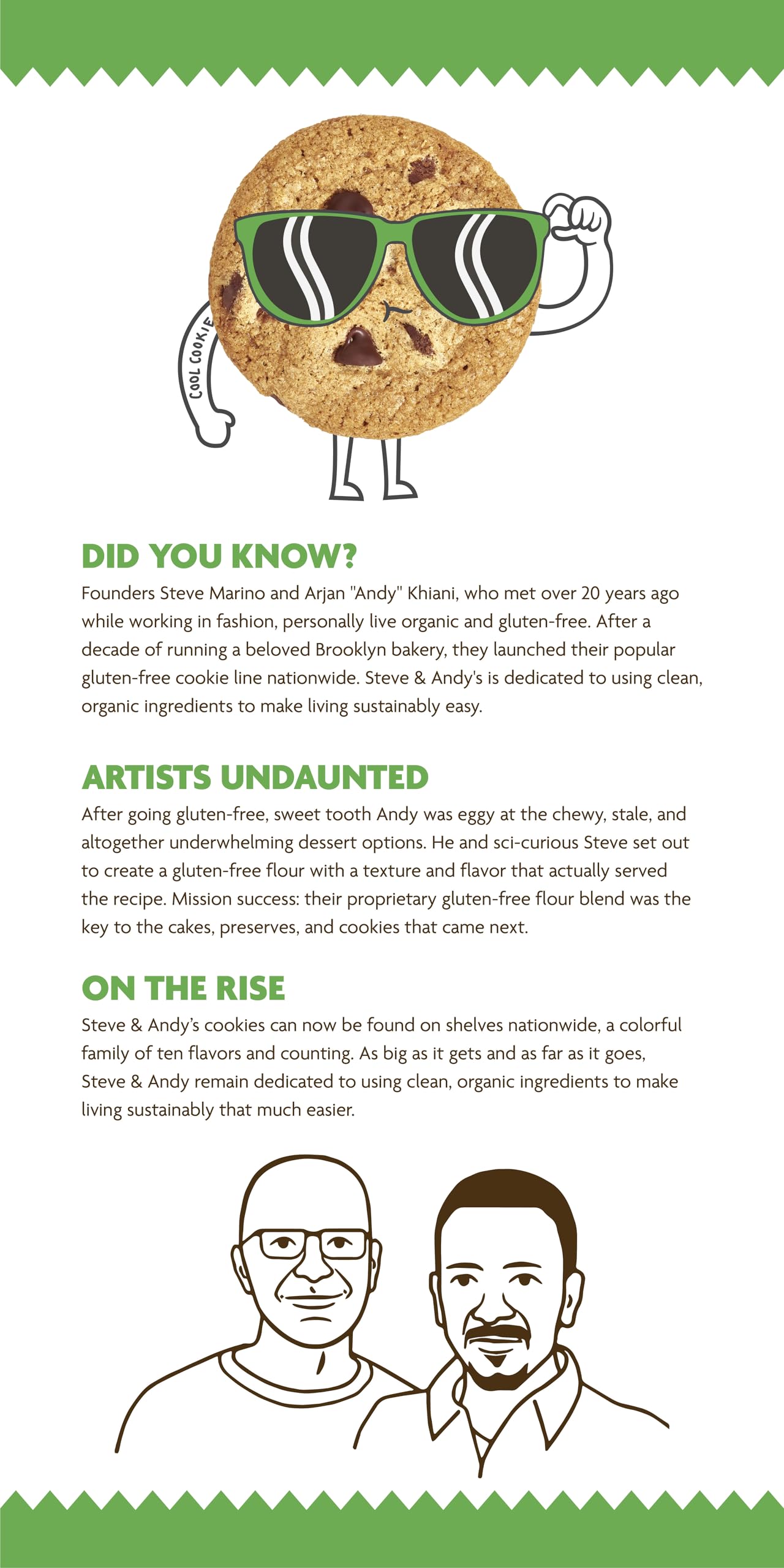 We spent years creating the perfect cookie that will satisfy your cravings in a healthy, yet flavorful way. At Steve and Andys Organic we take pride in using our very own gluten-free, all-purpose flour combined with other organic ingredients to ensure youre eating the cleanest cookie unlike any other. Our Soft-Baked Banana Chocolate Chip Cookies are the best of banana bread, transformed with cookie magic. Its a show like no other: organic fair-trade bananas dance with chocolate, molasses, and an earthy cinnamon spice blend. The triumphant soft-baked bite makes for a sweet finale to any breakfast.