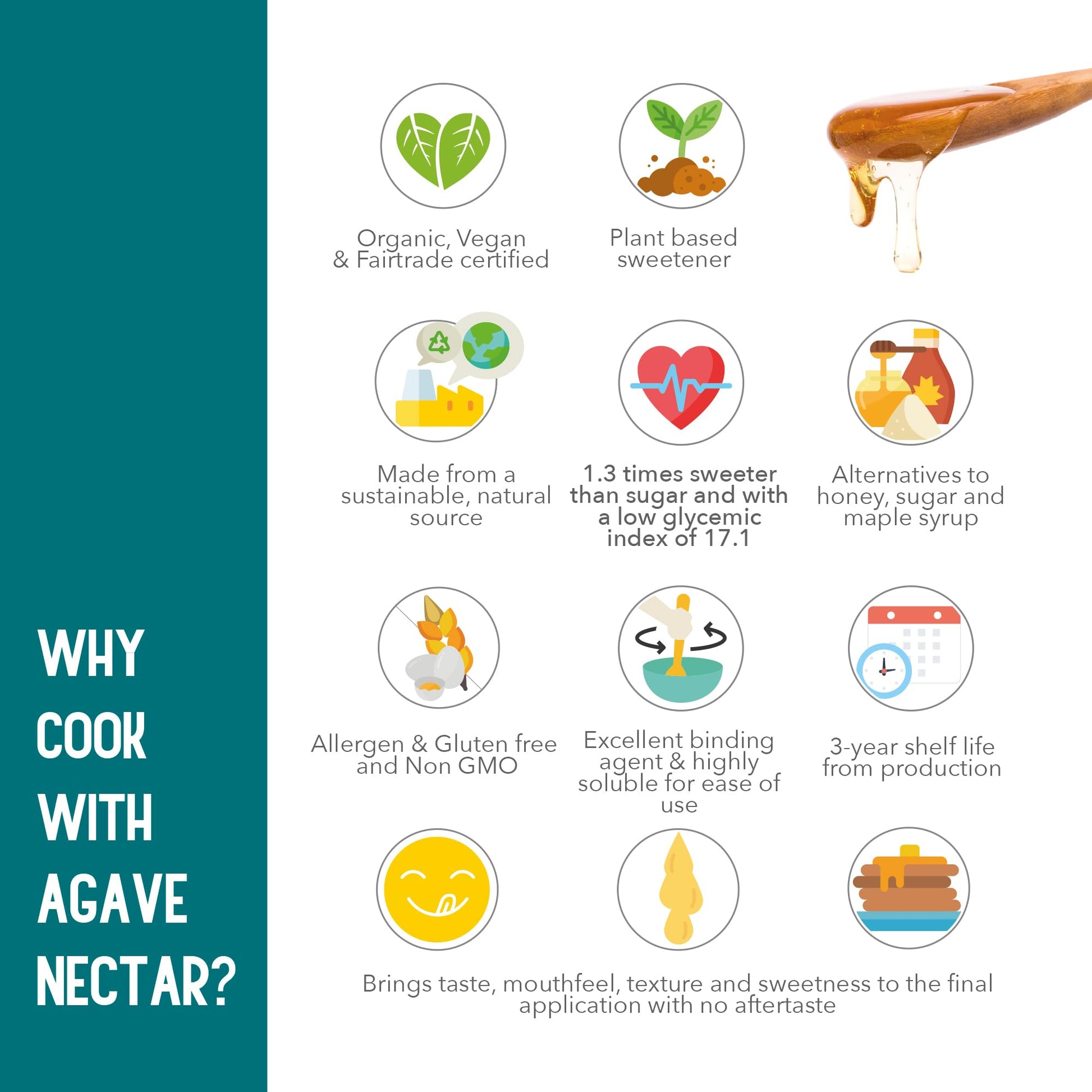 Blus Green organics light Blue Agave is available in convenient 1 gallon pet bottle Our organic light Blue Agave nectar has a neutral, mild flavor. It adds sweetness without flavor making it ideal for hot and cold beverages, baking, and desserts. A perfect substitute for sugar.