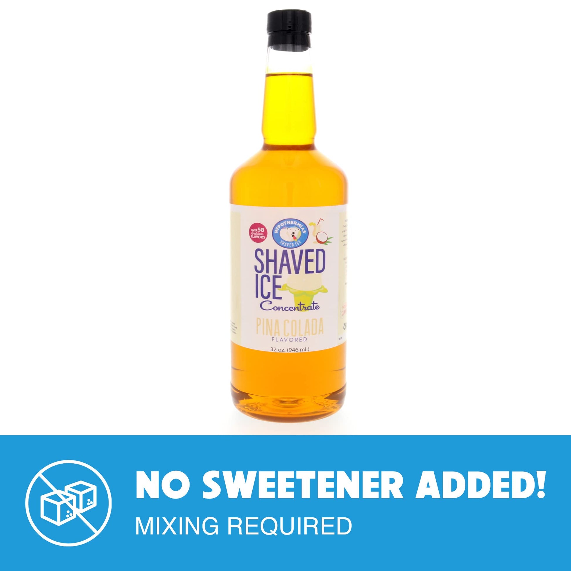 - Q: What are the packaging details of the Hypothermias flavor concentrate? A: The Hypothermias Pina Colada flavor concentrate is packaged in a quart-sized bottle, which contains thirty-two fluid ounces of concentrate.