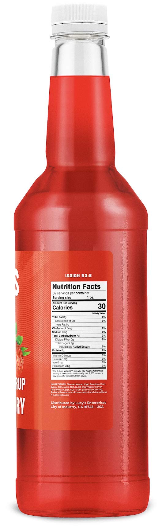- Q: What are the key ingredients in Lucy's Strawberry Syrup? A: While the specific ingredients are not listed, Lucy's Strawberry Syrup is known for its rich strawberry flavor and is designed to provide a sweet and tart experience.