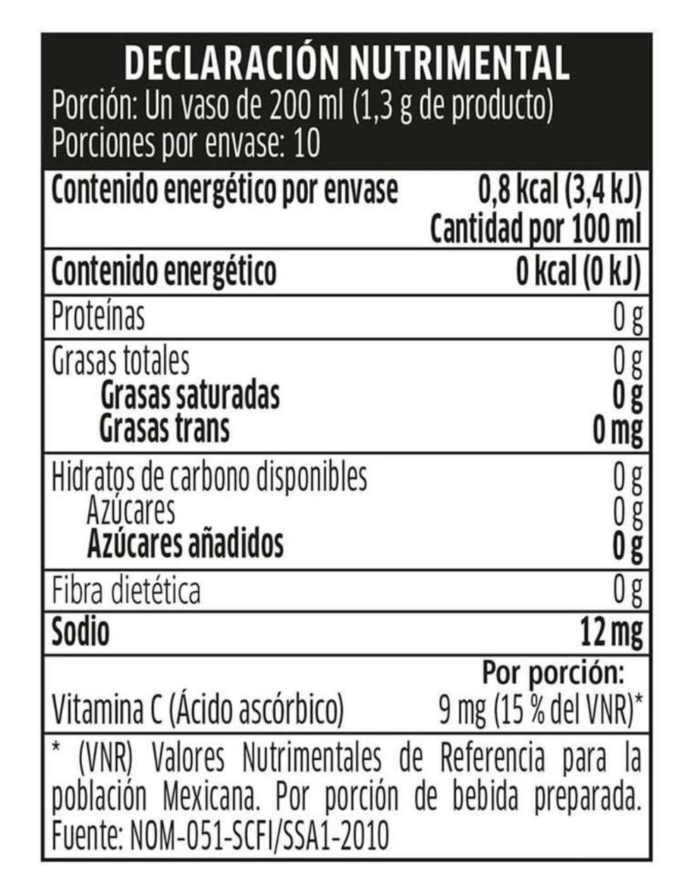 Nutritional Info From The Back Of The Package: Portion Per Cup 200Ml, Portion Per Pack 10, Enrergetic Contents: 34Kj (8Kcal), Proteins: 0G, Fat: 0G, Total Fat: 0G, Carbohydrates: 2G, Sugars: 1,9G, Diet Fiber: 0G, Sodium: 1Mg.