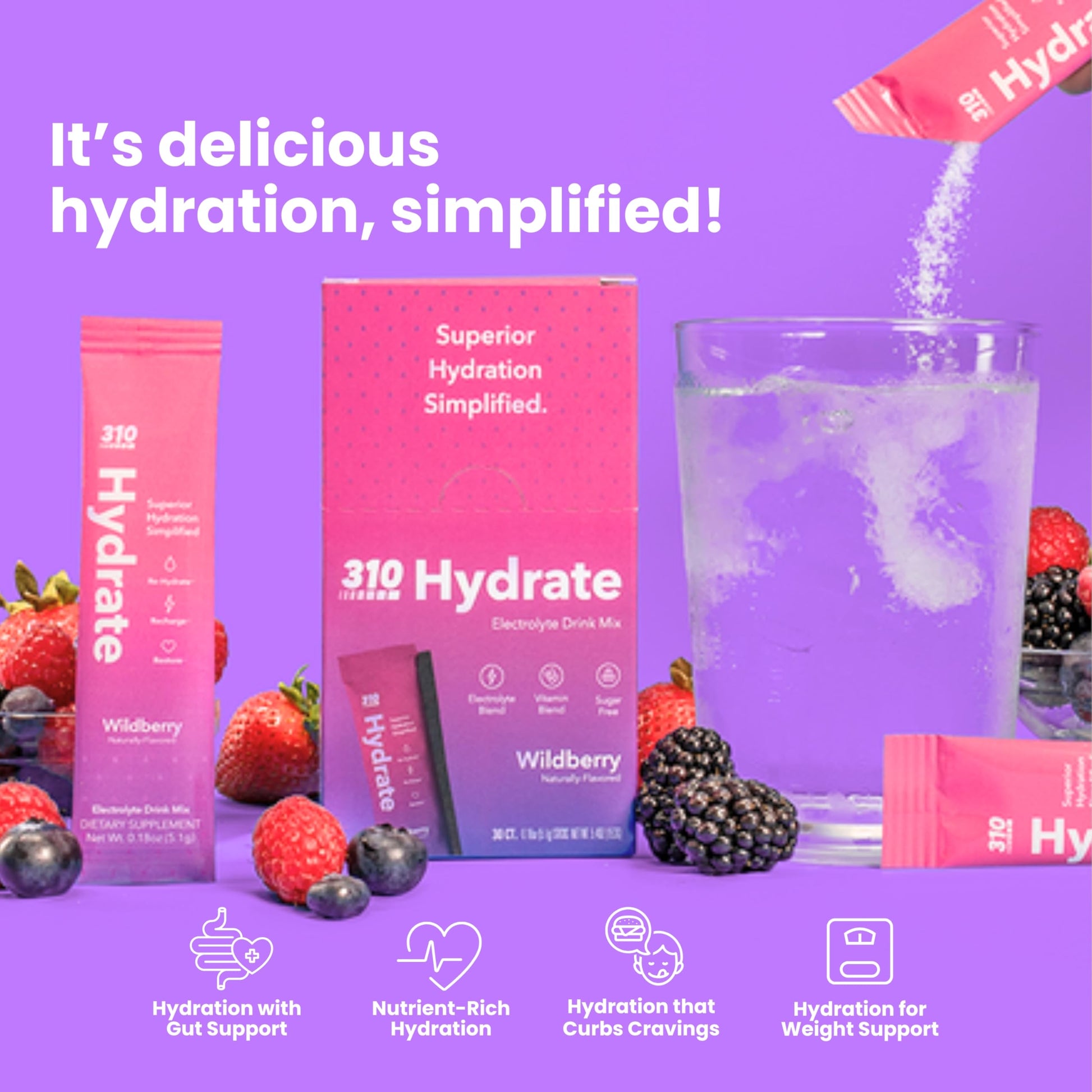 Supercharge Your H2O! 310 Hydrate Electrolytes Powder Gives You Superior Hydration And Superior Performance, With Key Vitamins And Electrolyte Minerals Including B Vitamins For Energy And Brain Health As Well As Vitamin C For Immunity. Its Faster Hydration When You Need It The Most. A Better Form Of Electrolytes Powder. No Sugar And High In Vitamins And Minerals, One Stick Of 310 Hydrate Electrolytes Powder Can Provide The Same Hydration As 2-3 Glasses Of Water, Giving You Energy, Focus And Refreshment From The Start To The End Of Your Day. Faster Hydration Thats Cleaner And Healthier And With Less Than 10 Calories Per Packet, 310 Hydrate Electrolyte Packets Are Sugar-Free, Keto Friendly And Come In A Variety Of Exciting Flavors To Suit Your Tastes. From Cucumber To Peach-Mango, Weve Got Your Body And Your Taste Buds Covered! 310 Hydrate Electrolytes Powder Packets Wildberry Hydration Packets 310 Hydrate Electrolytes Powder Gives You Superior Hydration And Superior Performance, With Key Vitamins And Electrolyte Minerals. Healthy, Sugar Free Electrolytes In A Variety Of Flavors And Less Than 10 Calories A Packet. Its Faster Hydration When You Need It The Most. Packed With Key Vitamins And Electrolyte Minerals, Including Vitamins B And C, For Faster Hydration Convenient, On-The-Go Electrolyte Packets Can Be Mixed With 16 Oz Of Cold Water For Instant Refreshment Sugar Free Electrolytes Powder, Available In A Variety Of Bold And Exciting Flavors. 310 Nutrition Fuel Better, Feel Better