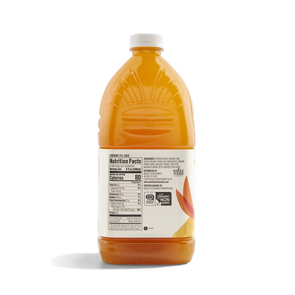 - Q: What are the main ingredients in 365 by Whole Foods Market Organic Mango Lemonade? A: The main ingredients in 365 by Whole Foods Market Organic Mango Lemonade include organic mango juice, water, and natural flavors. This refreshing beverage is crafted to provide a delicious taste while meeting rigorous quality standards.
