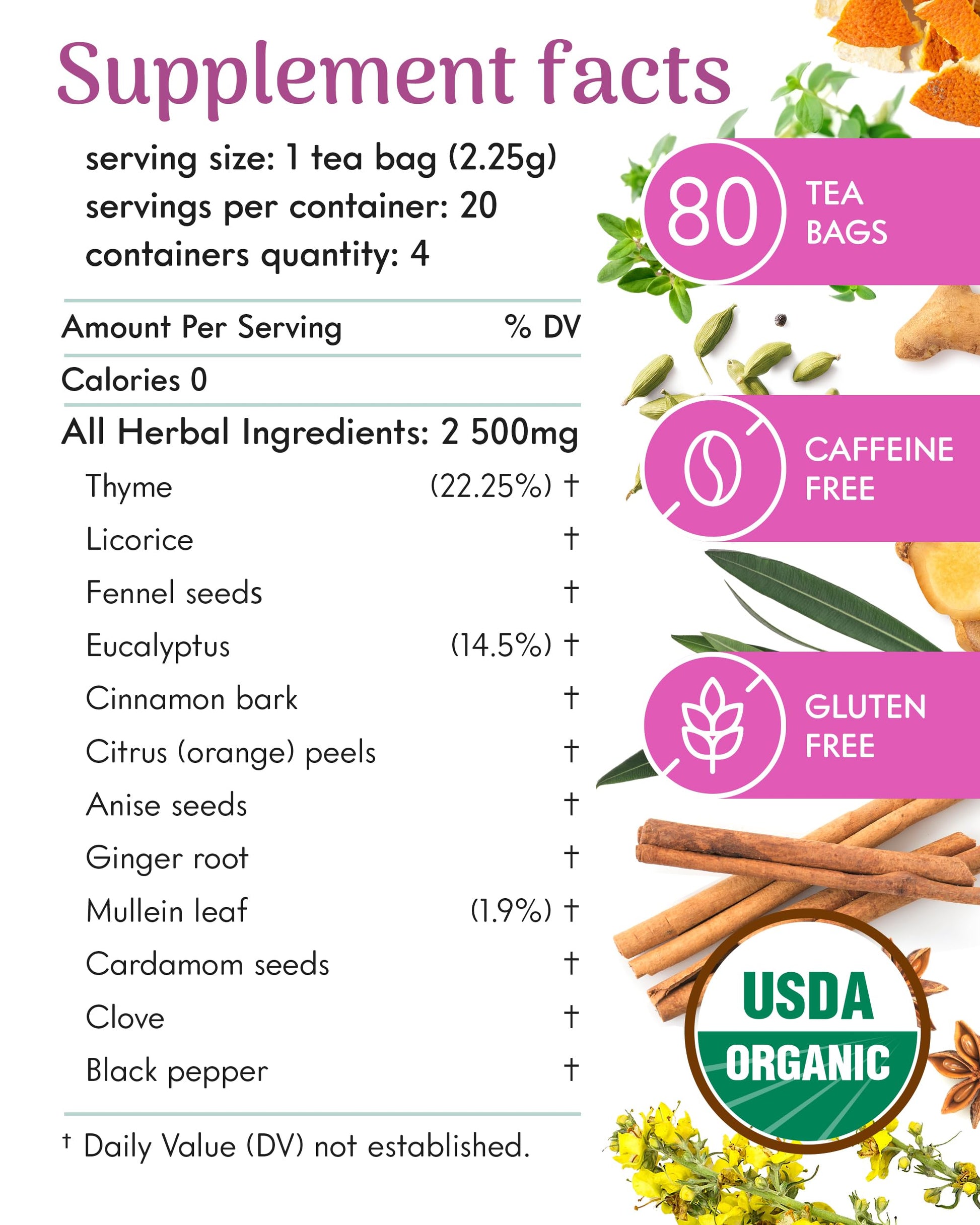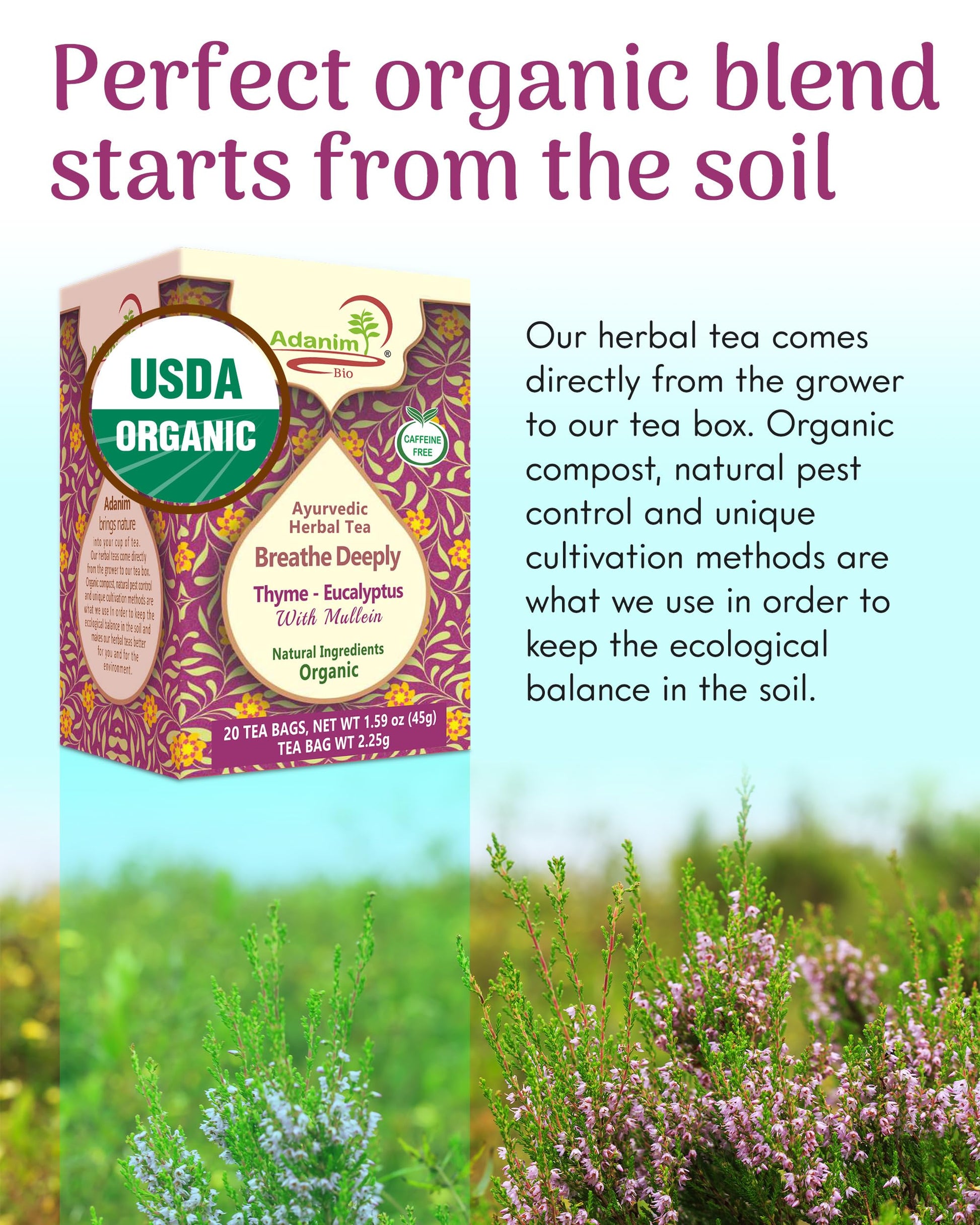 Adanim Bio Thyme Tea, Value Pack 80 Teabags With Organic Mullein Leaf And Eucalyptus Tea, Enhanced Respiratory And Lung Health, Caffeine Free Thyme Tea Bags