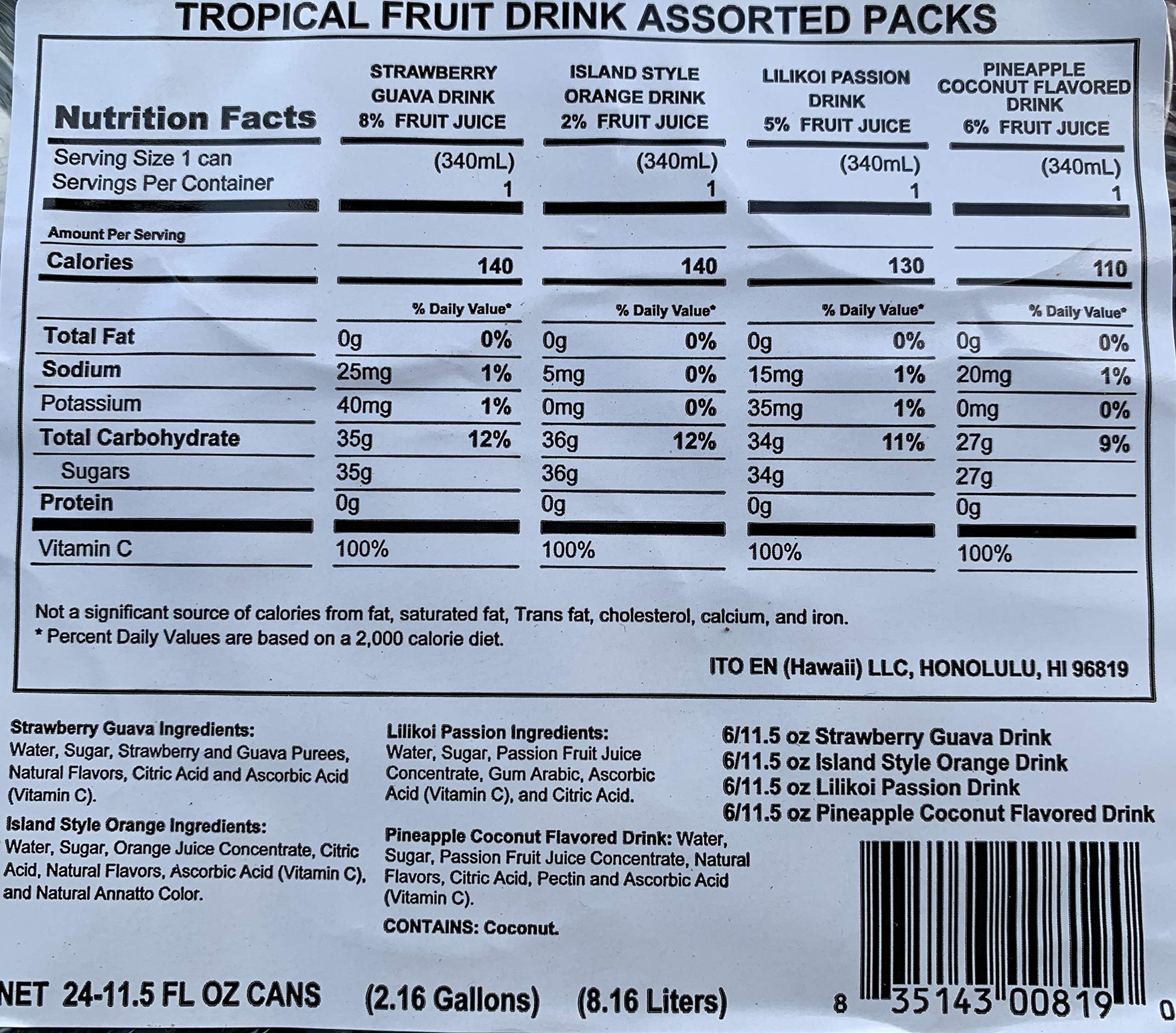 Four Delicious Flavors. Four Each Of Strawberry Guava Drink, Island Style Orange Drink, Lilikoi Passion Drink And Coconut Pineapple Drink. 24, 11.5 Oz. Cans Made In Hawaii.