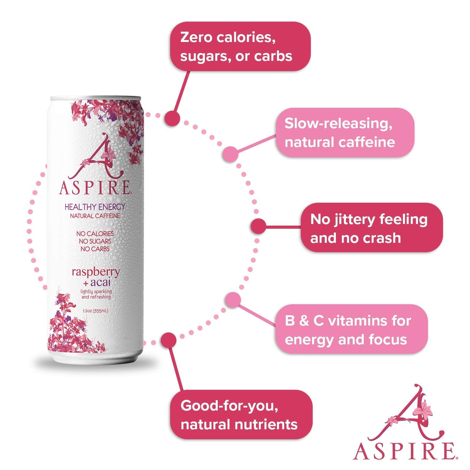 - Q: What are the main benefits of ASPIRE Healthy Energy drinks? A: ASPIRE Healthy Energy drinks provide a clean energy boost without sugar, carbs, or calories. They contain natural caffeine from green tea and guarana, which helps enhance focus and productivity without jitters or crashes. Additionally, each drink is enriched with essential vitamins B & C to support metabolism and overall health.