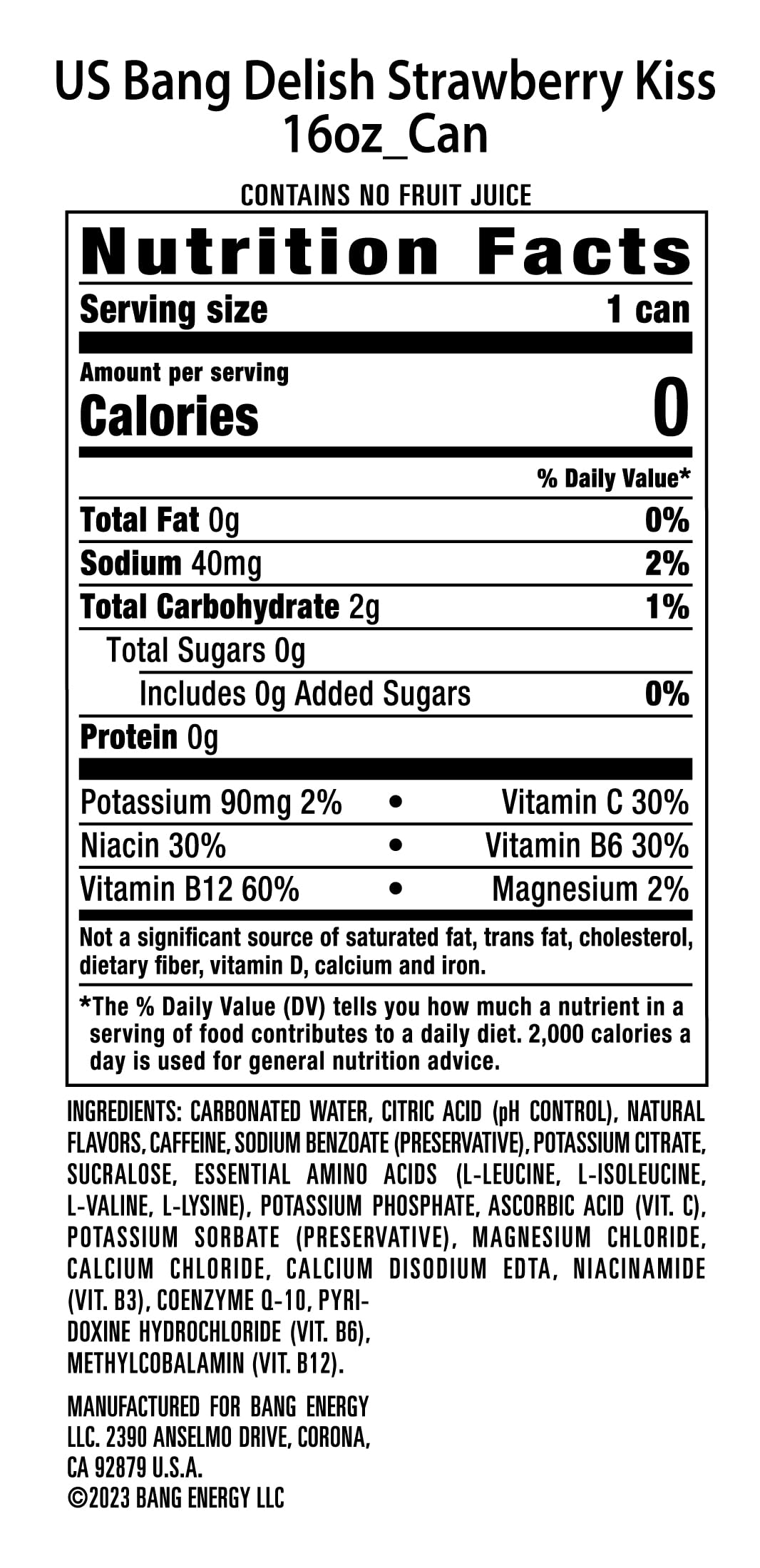 - Q: Is Bang Energy Delish Strawberry Kiss suitable for vegans and those with dietary restrictions? A: Yes, Bang Energy Delish Strawberry Kiss is gluten-free and vegan-friendly, making it suitable for various dietary lifestyles. It contains zero sugar, zero carbs, and no artificial colors, ensuring a clean energy boost.