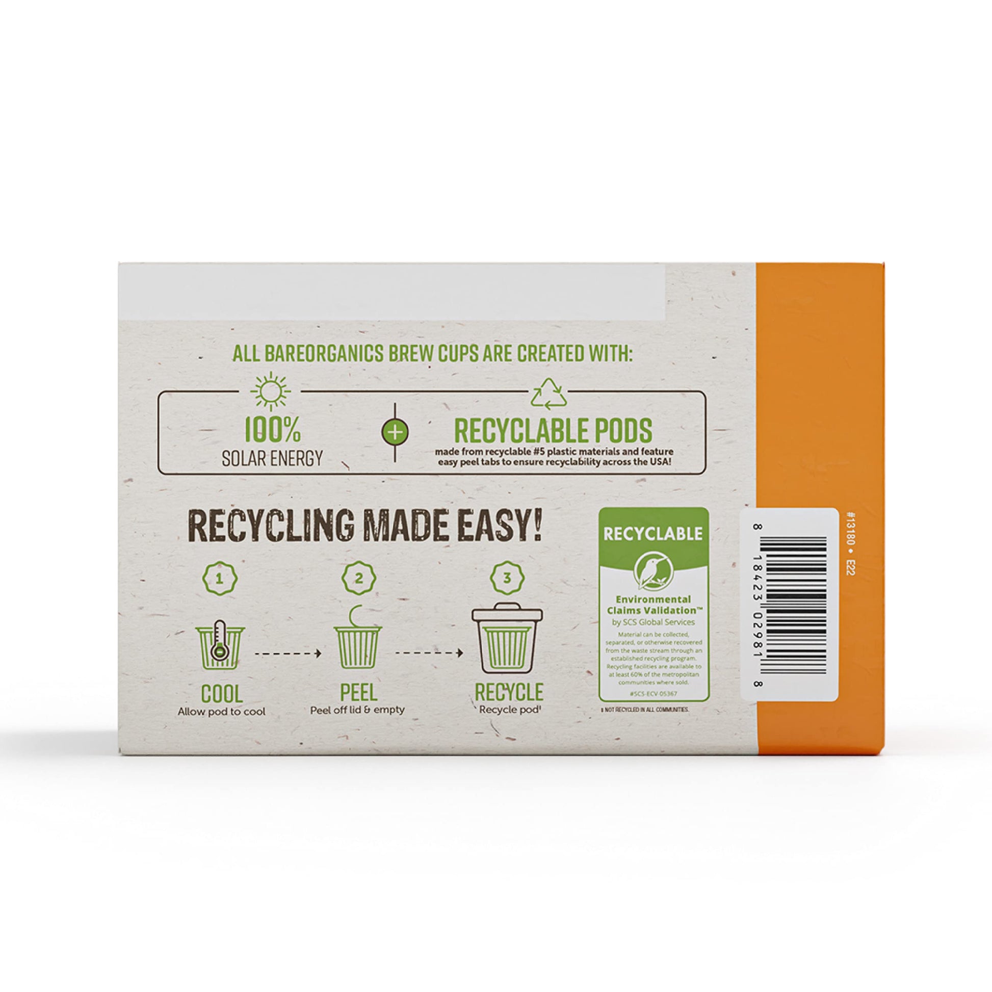 Q: Are the coffee pods recyclable?A: Yes, each pack of BareOrganics Focus Coffee includes 10 single-serve recyclable cups equipped with biodegradable filters, making them an eco-friendly choice.